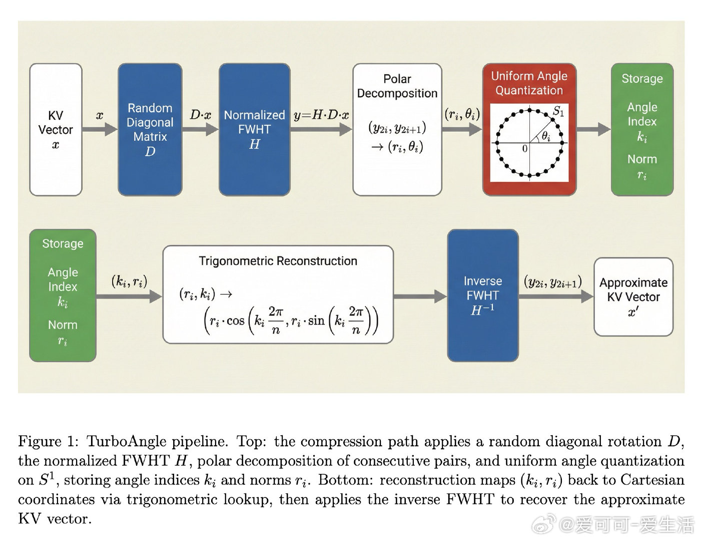 本文的核心洞见是:把"如何均匀量化分布不规则的数值"重新看作"先找到一个分布天然均匀的坐标系,再用最优量化器"。具体操作是在随机符号旋转后施加快速Walsh-Hadamard变换,使相邻元素对的角度在单位圆上趋近均匀分布——均匀分布对应的最优量化器恰好就是等间隔划分,无需任何校准。进一步地,对各层独立配置K/V码本大小,并对K范数用8位线性量化、对V范数用4位对数空间量化,形成零校准的端到端压缩方案。