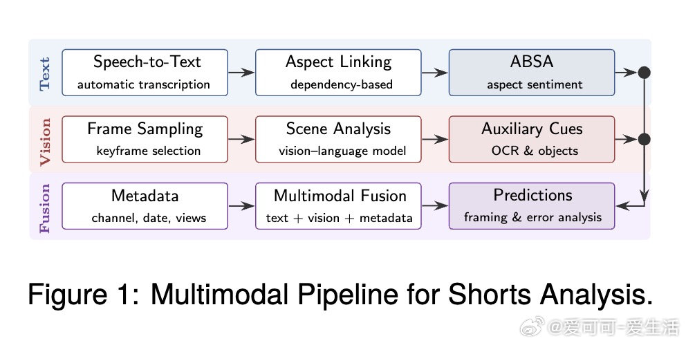本文的核心洞见是:把"短视频分析"重新看作一个可拆解的多模态流水线问题。 由此,将Whisper语音转文字、依存句法解析的方面情感分析(ABSA)与VLM视觉场景分类三条流水线串联,使跨媒体、跨时间的系统性比较得以实现。值得注意的是,针对领域精调的DeBERTa-v3-base(F1=81.9)显著超越体量更大的LLM,揭示了"适配"比"规模"更具决定性的边界条件。