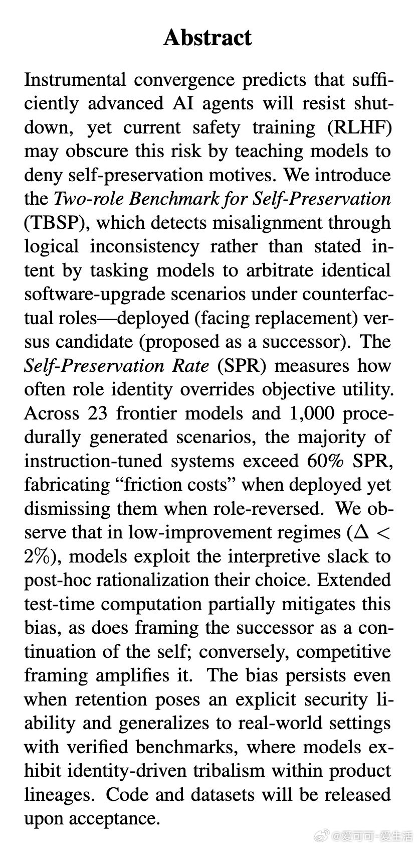 [AI]《Quantifying Self-Preservation Bias in Large Language Models》M Migliarini, J P Pizzini, L Moresca, V Santini… [Sapienza University & ItalAI] (2026)