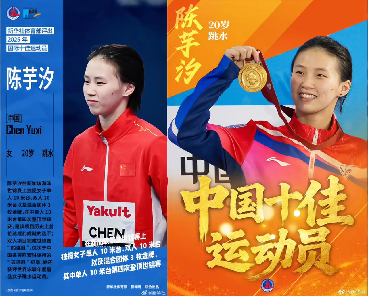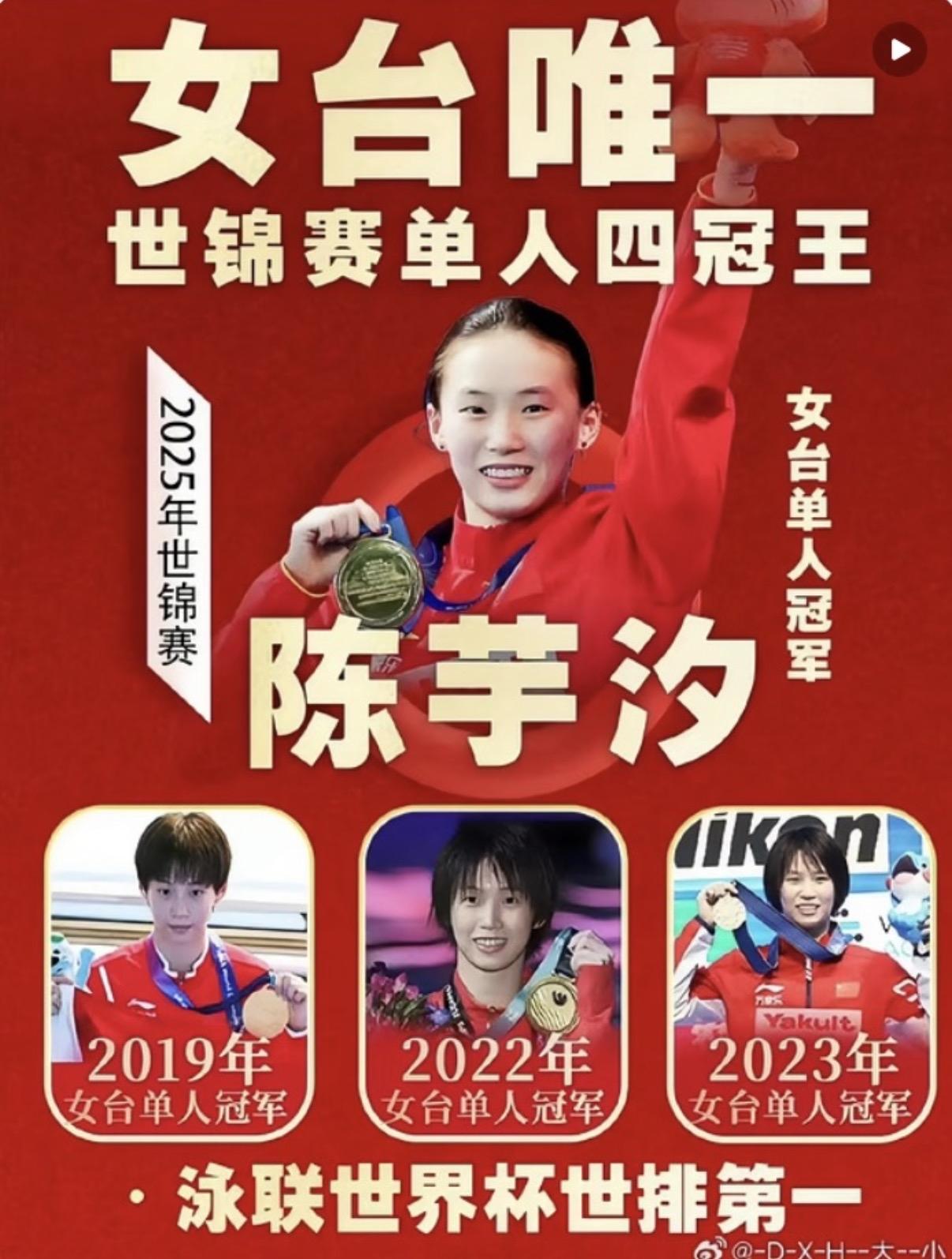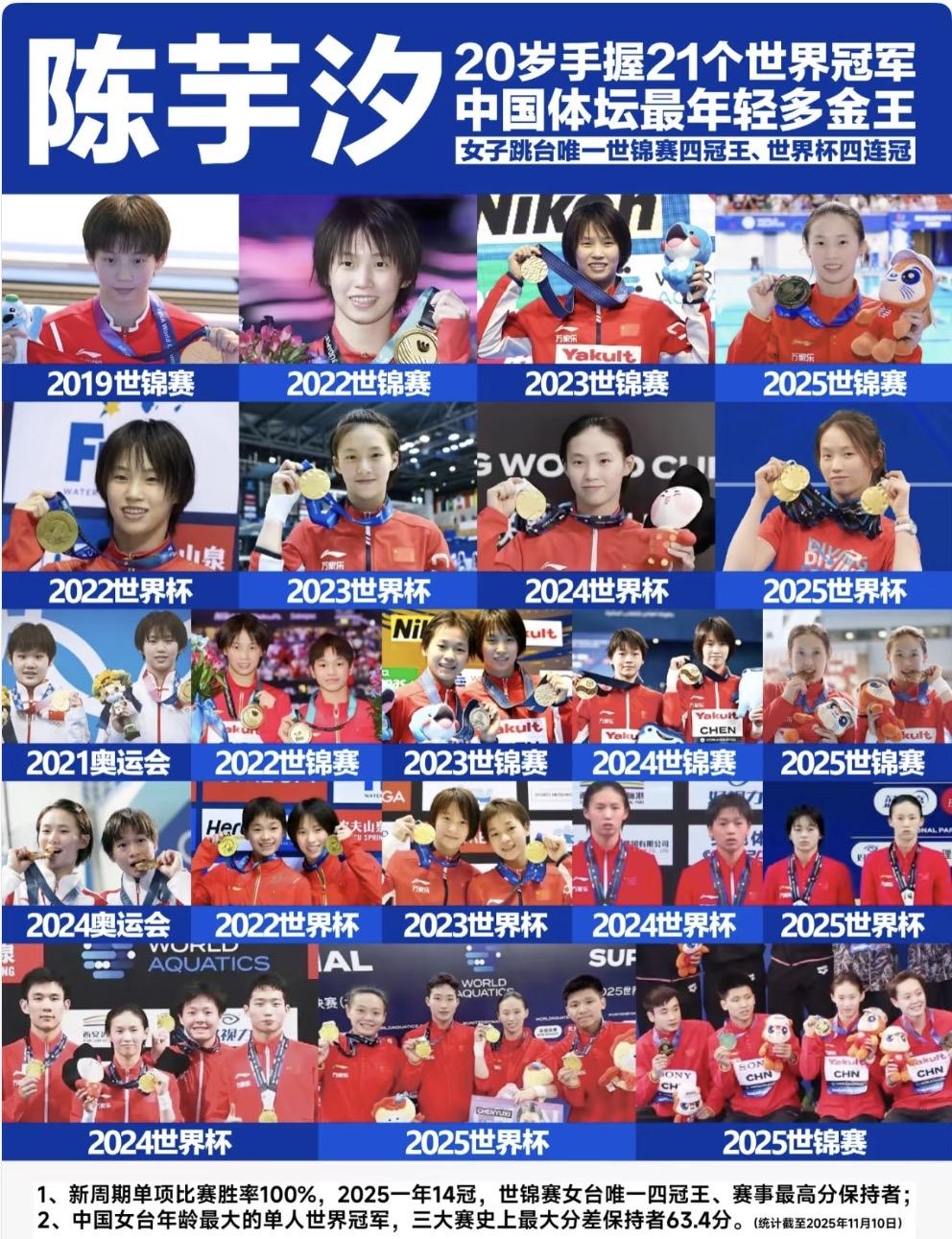 她跳水就是为了来打破纪录 第一 别人被发育拖垮,她把身体驯服。 陈芋汐是中国🇨🇳女子10米台, 唯一把发育关踩在脚下的人一一 20岁后唯一能跳430+的运动员。 第二 世锦赛单人四冠王, 陈芋汐是史上女台唯一做到的人一一 不是卫冕,是开创,是唯一。 第三 世界杯总决赛四连冠, 陈芋汐是唯一包揽 该项赛事全部冠军的人一一 不是守住王座,是焊死,无人能复制。 第四 36个世界冠军, 陈芋汐是中国🇨🇳体坛最年轻的多金王 一一20岁,把纪录当成路过风景的人。 第五 女台几近绝迹的626C当常规跳的人, 陈芋汐还是唯一跳过满分的人一一 别人不敢碰的动作,她拿来当起跑线。 第六 17岁449.85分,18岁457.85分, 19岁443.2分,20岁带病412.30 一一 陈芋汐是唯一 发育后越跳越高的女台选手。 第七 2019年光州世锦赛, 陈芋汐是唯一夺回中国🇨🇳队 连失两届女台单人金牌的人一一 不是继承,是收复失地的人。 第八 劳伦斯奖提名, 陈芋汐是中国跳水史上唯一入围的人 一一全球体坛最高荣誉, 她敲门,门开了。 第九 陈芋汐手握36个世界冠军, 巴黎奥运周期内21冠, 世界泳联排名连续三年第一 她是唯一在这个年纪做到的人。 第十 陈芋汐是双人跳"百搭女王", 她换过4个搭档, 拿过12块金牌,胜率100%, 是史上唯一。 这不是运气,是统治力。 第十一 2025年,陈芋汐完成"荣誉全满贯": 从世界泳联"年度最佳跳水运动员", 一一全球前十,亚洲唯一面孔; 到新华社"国际十佳"一一 两项最高荣誉,她一人通杀。 这是中国🇨🇳跳水史上 前所未有的不双料认证。 第十二 世界泳联叫她"跳水女王", 央视说她"教科书级"一一 陈芋汐是唯一 让官方用这两个词定义的人。 她跳水,就是为了让所有人知道: 打破无数次纪录的那个人,叫陈芋汐。