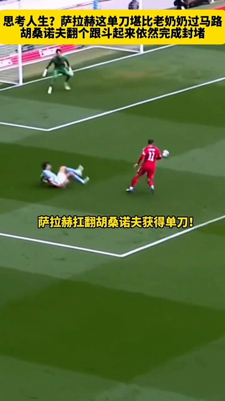 思考人生?萨拉赫这单刀堪比老奶奶过马路,胡桑诺夫翻个跟斗起来依然完成封堵。 足总杯1/4决赛曼城vs利物浦,萨拉赫扛翻胡桑诺夫获得单刀。 这调整太慢了,这调整速度胡桑诺夫翻个跟斗起来依然可以完成防守。