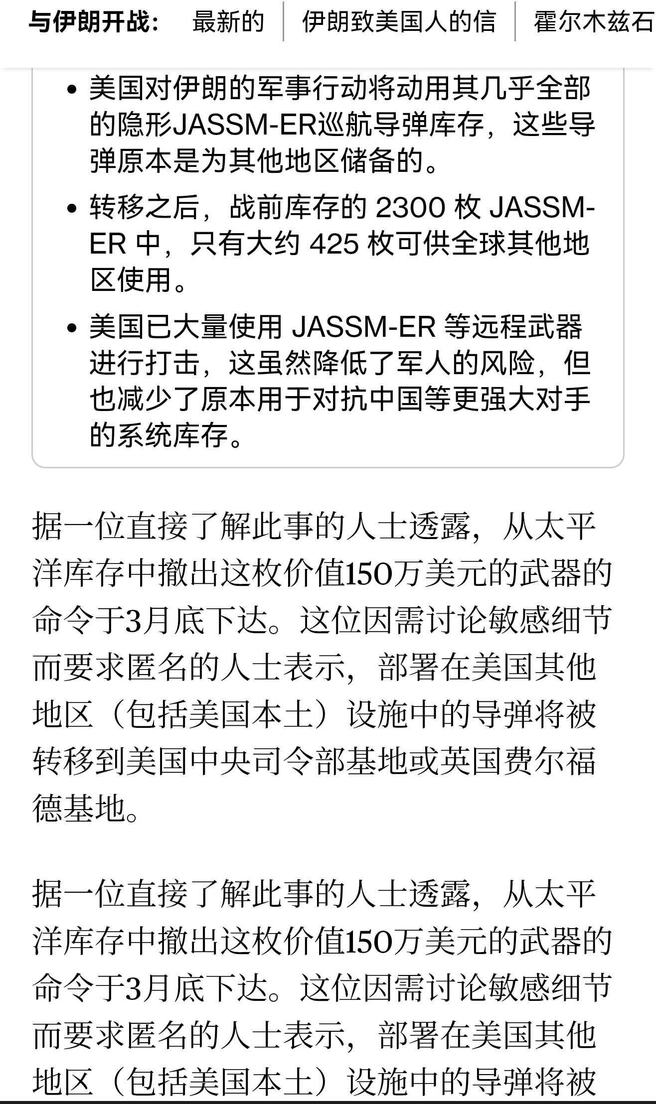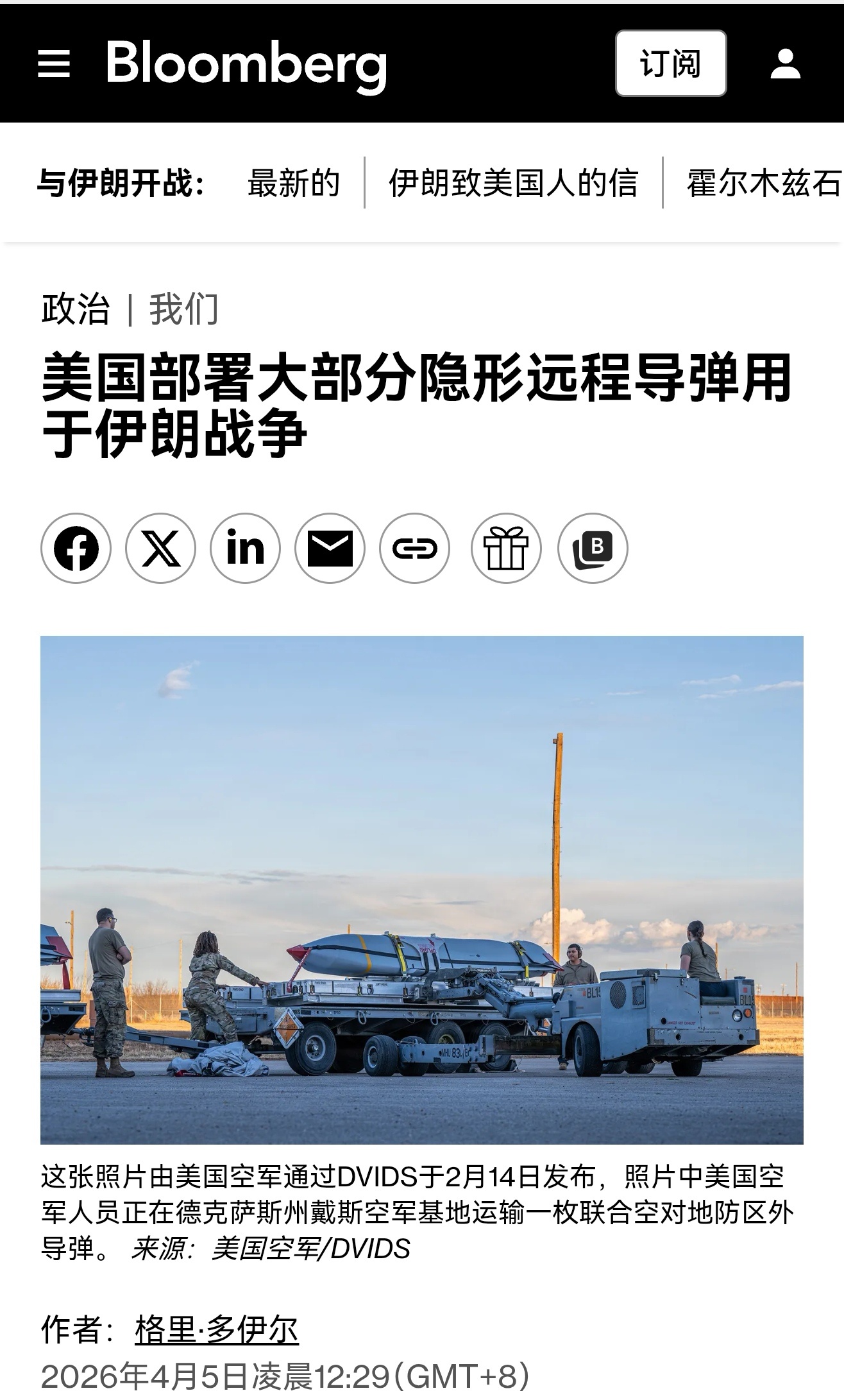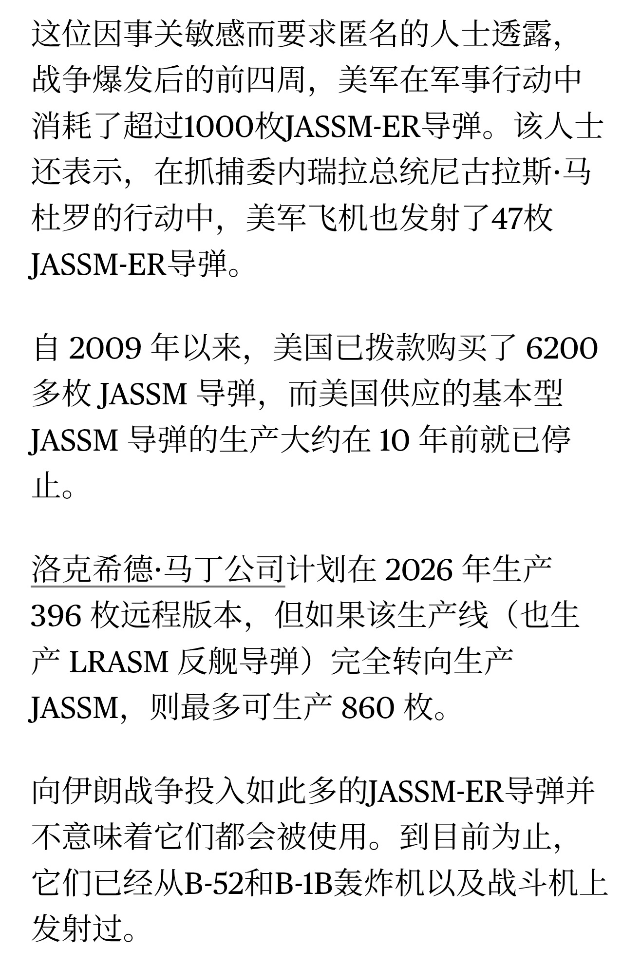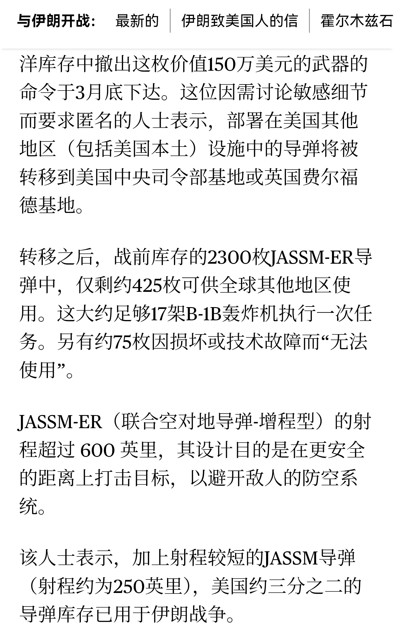 🔻彭博社报道,根据美军内部可靠人士透露,美军于3月底已经下令将西太平洋的JASSM导弹库存大部分转移到中东用于伊朗战争。🔻美军库存2300余发JASSM ER(AGM-158B)导弹中,已经有超过1800发调往中东,只剩下400多发备用。🔻而JASSM基础型(AGM-158A)的库存也已经大部调往中东,超过三分之二的库存已经前往了中东。🔻已经结束咧,老美根本不想和老中在西太干架了,彻底躺平