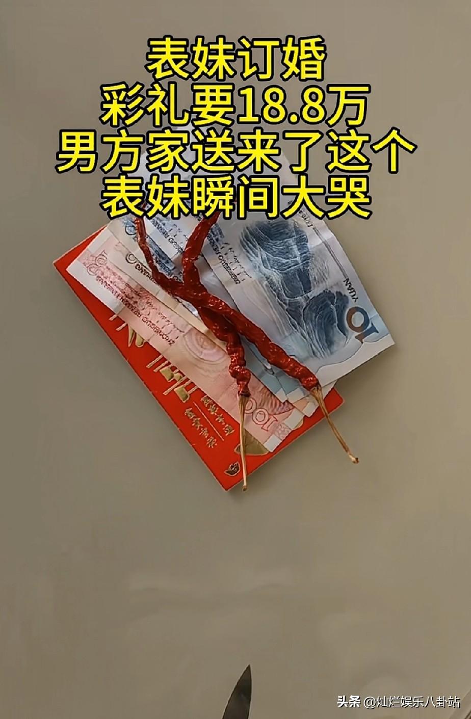 表妹订婚 彩礼要了18.8万 男方家送来一百五十和两个辣椒, 表妹瞬间大哭。 你们知道这个是什么意思嘛! 结果拿不出来这么多钱,只给女孩送了一个红包,里面装了一百五十块钱和两个海椒。气的女孩当场大哭,自己好不容易找一个自己喜欢的人,结果被彩礼钱压的喘不过气,这个婚还怎么结呀!他家条件不允许,我该怎么办呀! 唉呀,不管是谁?不是说不要彩礼?是看你真的想跟那个男孩子过日子。 那得看对方的能力和经济条件允许不?不是说他舍不得,他确实只有落弱的能力,为了取你18.8不多吗? 对一个打工人而言工资只有 三四千一个月,你说他除了生活费还要去还账,这样的日子想办法借到钱给了你彩礼还不是要你跟他一起努力还账吗? 我女儿结婚才给我三万六千块钱,结婚后都把六千块钱卡转他还房贷去了,我带女儿只有倒贴,没有办法女儿自己喜欢看上的? 在你们那里这个表示是什么?
