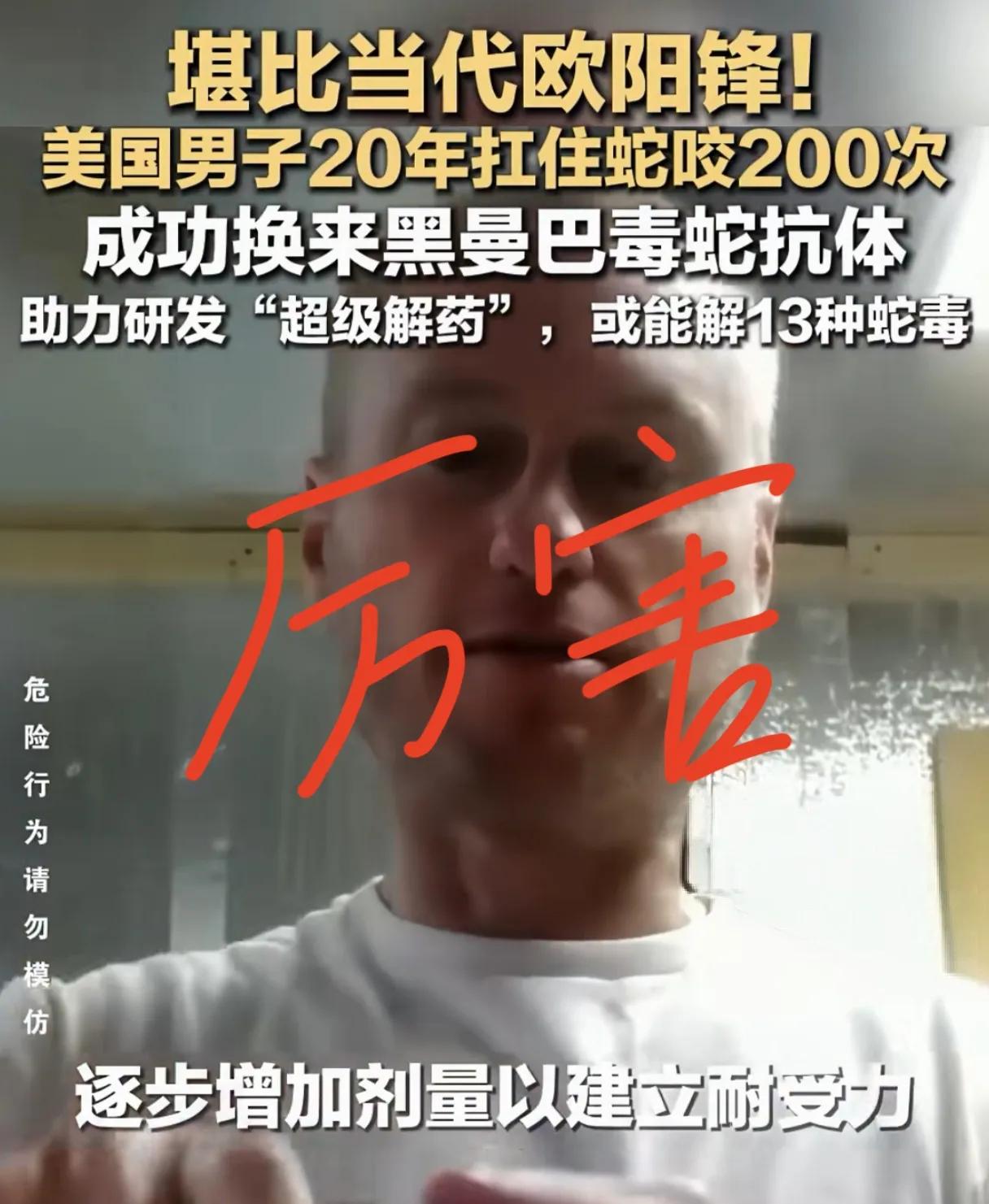 古有神农尝百草,今有专家扛毒蛇咬,20年被咬200多次太震撼! 古有神农尝百草,救黎民于病痛;今有狂人以身试毒,为科研赴险途。 美国这位蛇毒专家蒂姆·弗里德,用20年时间,做了一件让所有人胆寒的事——主动被毒蛇咬伤200多次,还自行注射蛇毒超800次,直面黑曼巴、太攀蛇、眼镜蛇等世界顶级剧毒蛇类,拿自己的身体当成了天然的“毒理学实验室”。 很多人说他疯了,可他并不是盲目冒险。起初只是出于对蛇毒的好奇,尝试注射微量毒液建立身体耐受力,一步步加大剂量,最后干脆让毒蛇撕咬。这20年里,他数次与死神擦肩而过,曾被眼镜蛇咬伤后陷入昏迷,在ICU躺了整整4天才捡回一条命,剧痛、肿胀、器官受损,每一次咬伤都是在鬼门关走一遭。 但这份近乎偏执的坚持,终究换来了了不起的成果。长期的毒液刺激,让他的身体产生了特殊的高效抗体,如今他的血液被用于实验性抗蛇毒血清研发,有望攻克多种剧毒蛇咬伤的治疗难题,拯救无数被毒蛇伤害的生命。 有人说科研需要严谨,也有人说他的方式太过极端,但不可否认,正是这份敢为科学舍身的勇气,推动了医学的进步。 这哪里是疯狂,分明是用凡躯践行科研精神,以血肉之躯为人类健康铺路,致敬每一位为科学无畏前行的人! 美国一男子20年间被毒蛇咬200多次蛇咬中毒