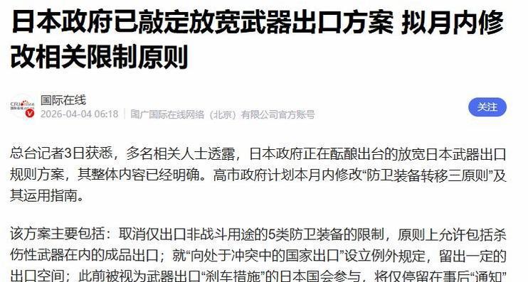 炸锅了!4月3日日本高市政府已经正式敲定决策,要全面放宽武器出口的相关限制,并且计划在本月内完成所有修改流程。 这一消息一出,瞬间引发全网热议,不少网友直呼这是要彻底抛开和平底线,太不负责任了。 很多人可能不清楚,在此之前日本的武器出口管控得极其严格,只能对外出口救援、运输这类没有攻击性的5类装备,说穿了就是只能卖些“帮衬用”的东西,像那些能直接打仗、伤人的武器,是绝对不允许出口的。 但现在,他们要把这个紧箍咒彻底摘掉,往后不管是什么类型的武器,哪怕是能直接造成伤亡的杀伤性武器,原则上都能自由出口。 更让人难以接受的是,他们还特意留了个漏洞,就算是正处于冲突中的国家,也有机会从日本买到武器,只不过设置了一个例外条款,这就相当于直接给武器流入战乱地区打开了方便之门。 以前日本国会还能对武器出口起到监督作用,就像是给这项行为装了个“刹车”,可现在呢?国会彻底失去了管控权,顶多就是事情发生后被告知一声,几乎等同于放任不管。 一开始由自民党和日本维新会组成的执政联盟,还只是提议修改一下相关的使用指南就好,没曾想高市政府比他们还要激进,不仅要改指南,连“防卫装备转移三原则”本身也要进行修改。 除此之外,他们还打算组建一个新的协调小组,让多个相关部门一起负责统筹武器出口的相关事宜,看得出来,他们是铁了心要靠卖武器来“做文章”。 其实早在去年年底,日本就多次透露出要放宽武器出口的苗头,当时这件事在日本国内就引起了不少民众的反对和担忧。 日本作为二战的战败国,本就应该牢牢守住和平的底线,可现在却一门心思要给武器出口“松绑”,说白了就是想靠卖武器牟取利益,同时提升自己在国际上的军事影响力,至于这么做会带来什么严重后果,他们似乎根本没放在心上。 这件事的危险性真的不容小觑,一旦日本彻底放开武器出口,不仅会让周边地区的局势变得更加紧张,还可能让更多的武器流入战乱区域,让更多无辜的人陷入苦难之中。 而且这种做法,也违背了日本国内大多数民众的意愿,毕竟没有人愿意被卷入战争的风险之中,谁都想安稳过日子。 说到底日本这次全面放宽武器出口限制,根本不是所谓的“推动产业发展”那么简单,其本质就是在突破和平的底线。