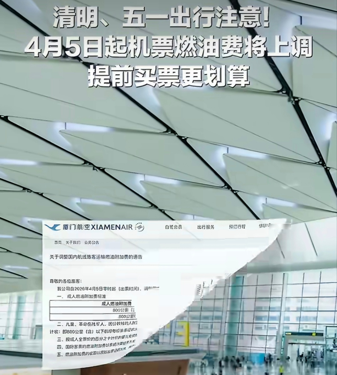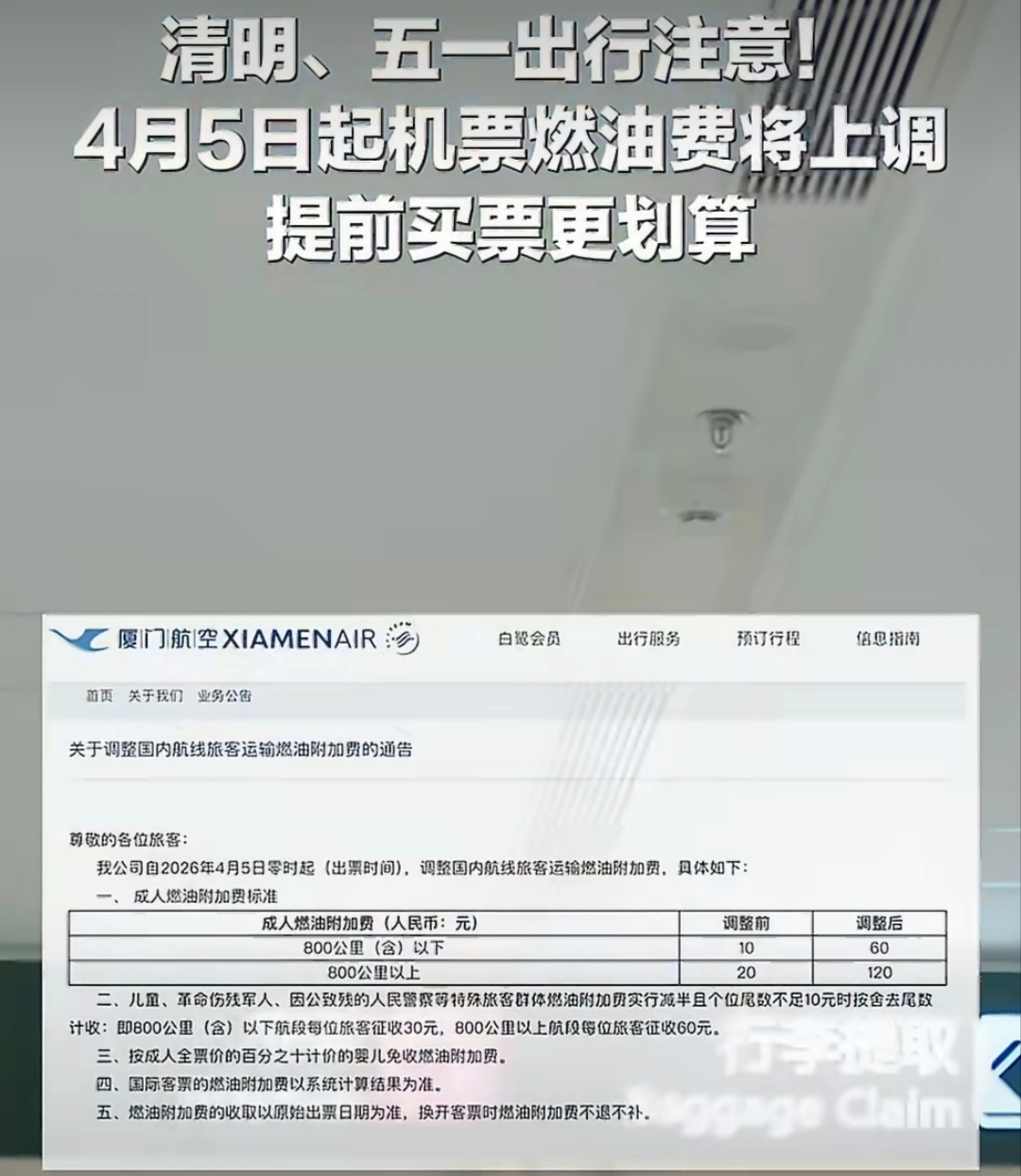 国内航线燃油附加费今日起调整4月5日起国内航线燃油附加费大幅上调,短途60元、长途120元,涨幅显著。此举直接增加旅客出行成本,家庭出游与高频出行人群压力更明显。对航司而言,能缓解航油成本压力,维持运营稳定。建议普通旅客规划行程时对比高铁,错峰出行更划算,也希望行业在成本与民生间找到平衡,避免过度影响出行意愿。