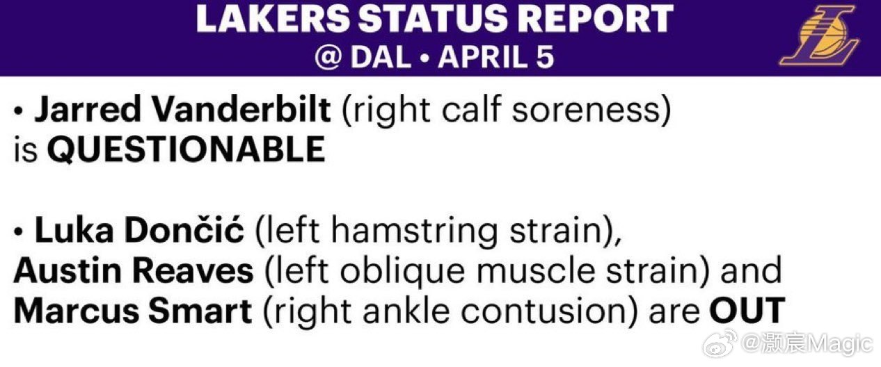 东契奇(左腿筋二级拉伤)、里夫斯(左侧腹斜肌二级拉伤)和斯玛特(右脚踝挫伤)缺席比赛。湖人vs独行侠