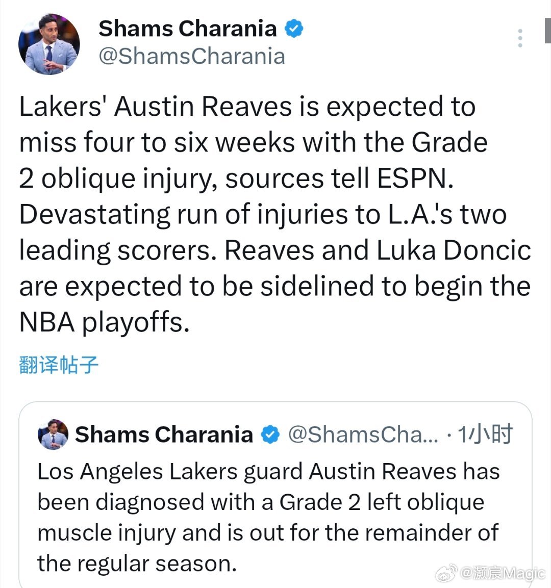 41岁詹姆斯独自扛起湖人屋漏偏逢连夜雨!Shams:里夫斯左侧腹斜肌二级拉伤,预计将缺席4至6周!里夫斯和东契奇预计将缺席NBA季后赛的开局阶段。湖人三巨头变单核里弗斯伤缺四到六周
