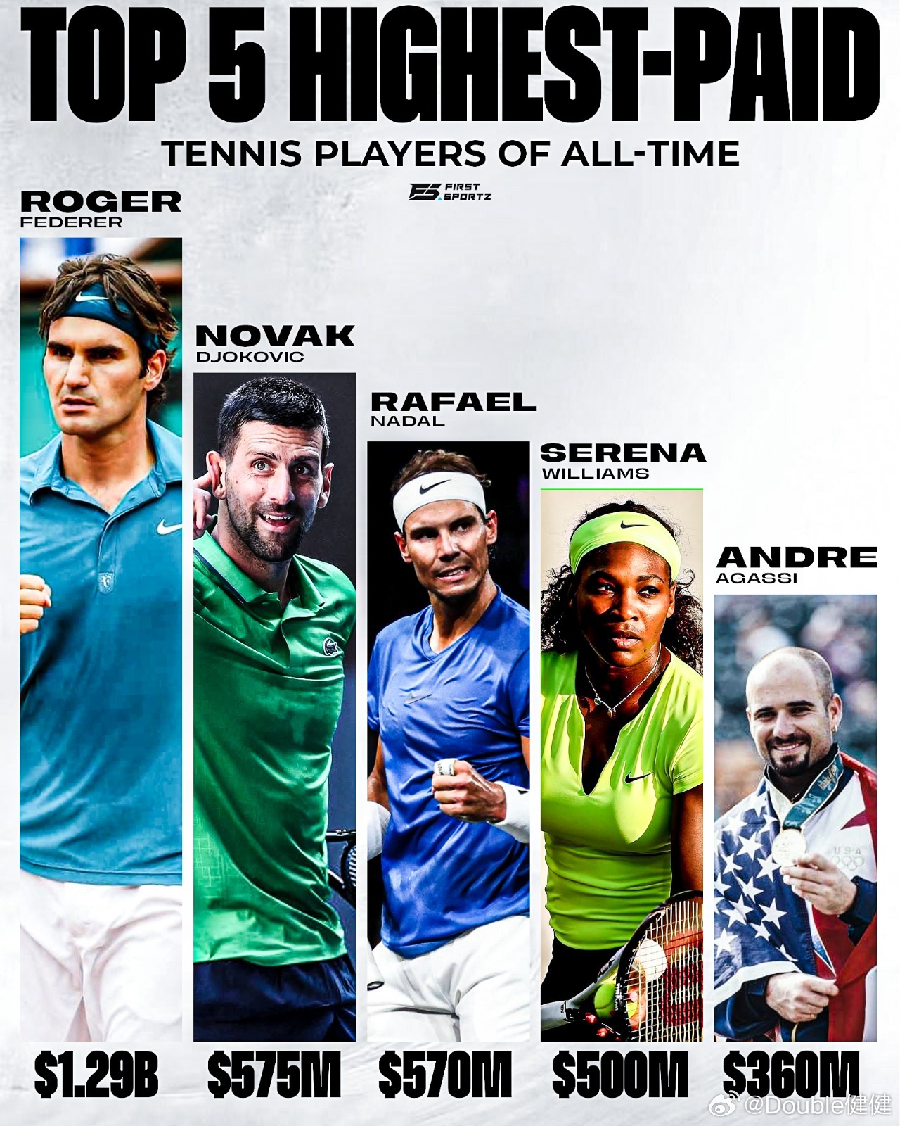 据Sportico报道,史上收入最高的50位运动员中,有5位是网球运动员,其中小威是唯一的女性。费德勒是该榜单前十名中唯一的网球运动员。史上收入最高的五位网球运动员(未经通货膨胀调整的收入):🇨🇭费德勒——12.9亿美元🇷🇸德约科维奇——5.75亿美元🇪🇸纳达尔——5.7亿美元🇺🇸小威——5亿美元🇺🇸阿加西——3.6亿美元红土撒野季ATP