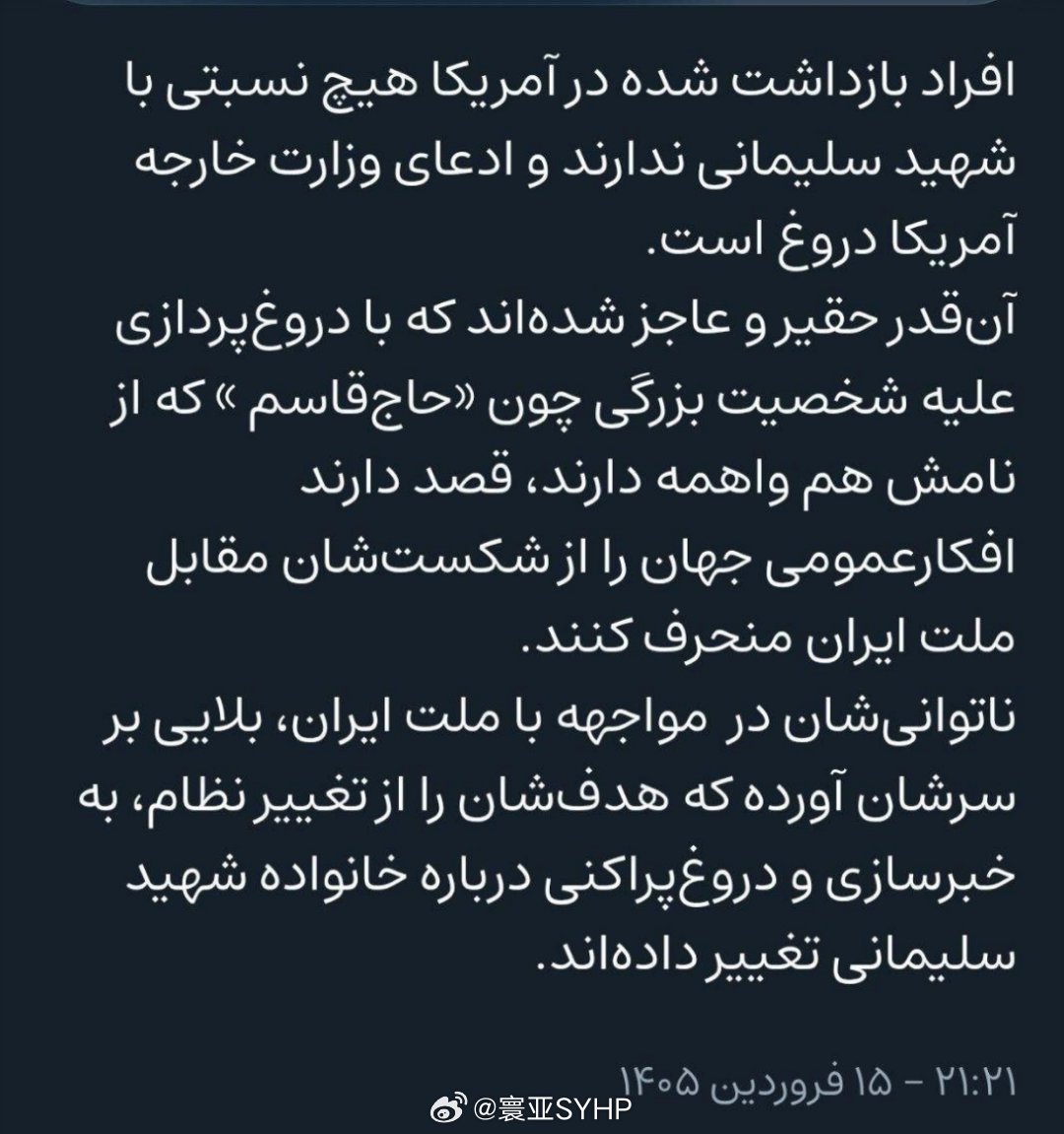 苏莱曼尼女儿扎伊娜卜(泽纳布·苏莱曼尼)说,美国国务院的说法是谎言,在美被捕人员与苏莱曼尼毫无关系。