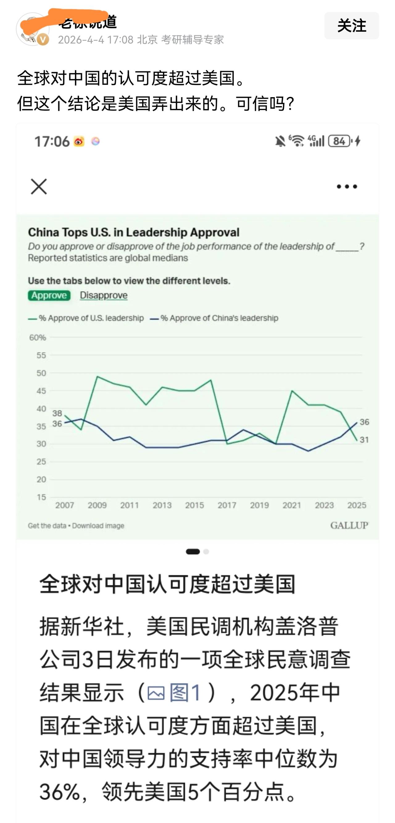 一边是盖洛普的民调,一边是某考研辅导专家的阴阳怪气。盖洛普民调的这份报告,到底戳了谁的肺管子呢? 老祖宗有句实践真知的话:“得道者多助,失道者寡助”。以如今美国这样的行事风格,无视任何规则,毫无契约精神,谁会喜欢呢?就问一句,如果你身边有这样的人,你愿意亲近吗?还是你更愿意和一个守法经营,有钱大家一起赚的人呢?