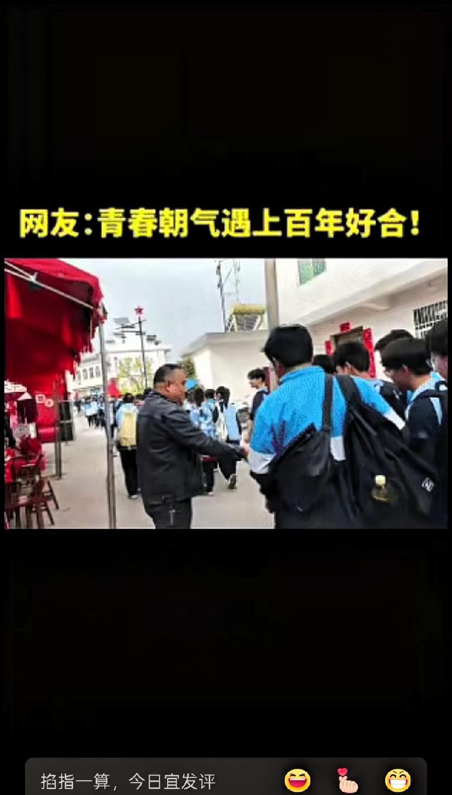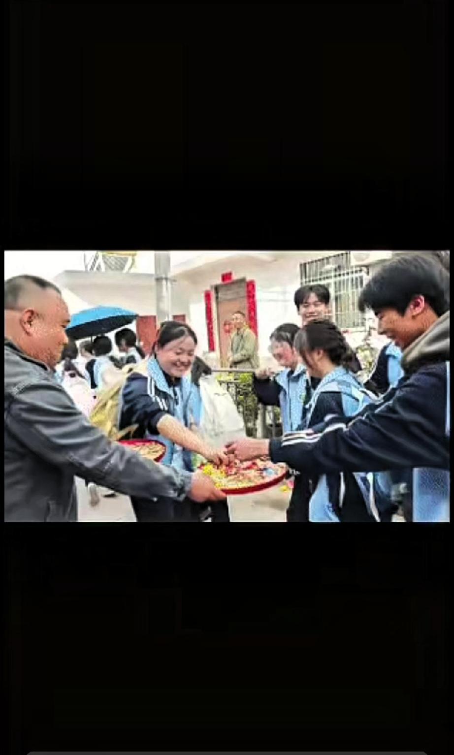 “火到人民日报了!”陕西安康,一对新人举办婚礼,谁知,就在婚礼即将结束时,刚好遇到高一学生徒步祭奠英烈,新郎看到这一幕,没有丝毫犹豫,马上让家人拿出准备好的喜糖和花生,分给路过的学生们,把自己的喜事和少年们一同分享。 学生们也很有礼貌,接过糖果后纷纷停下,真诚地向新人送上祝福,一来一往之间,温馨又自然。 一边是寻常人家的喜事,一边是庄重的缅怀之行,两者相遇没有丝毫违和,反而格外暖心。 现在很多婚礼都讲究排场和面子,比场面、比花销,可真正让人记住的,往往是这些藏在细节里的善意与格局。 新郎懂得尊重少年,敬畏英烈,学生们也懂礼貌、知感恩,这样平和又温暖的互动,比任何华丽的布置都更有意义。 我们能安安稳稳办喜事、享团圆,正是因为有先辈的付出。在开心过日子的同时,心怀感恩、不忘来路,才是对生活最好的态度。 这场简单的婚礼,也让我们看到,平凡生活里的真诚与尊重,最是珍贵。喜事有温度,做人有格局,这样的家庭未来一定和和美美。 这样朴实又暖心的相遇,你看完心里是不是也很温暖?