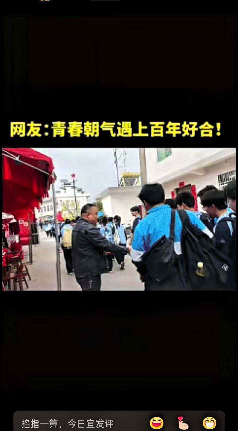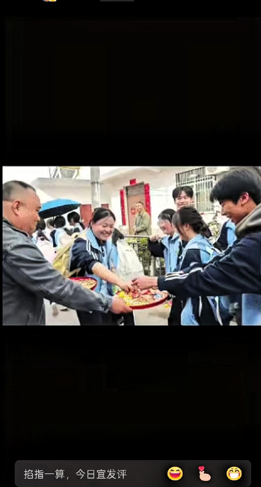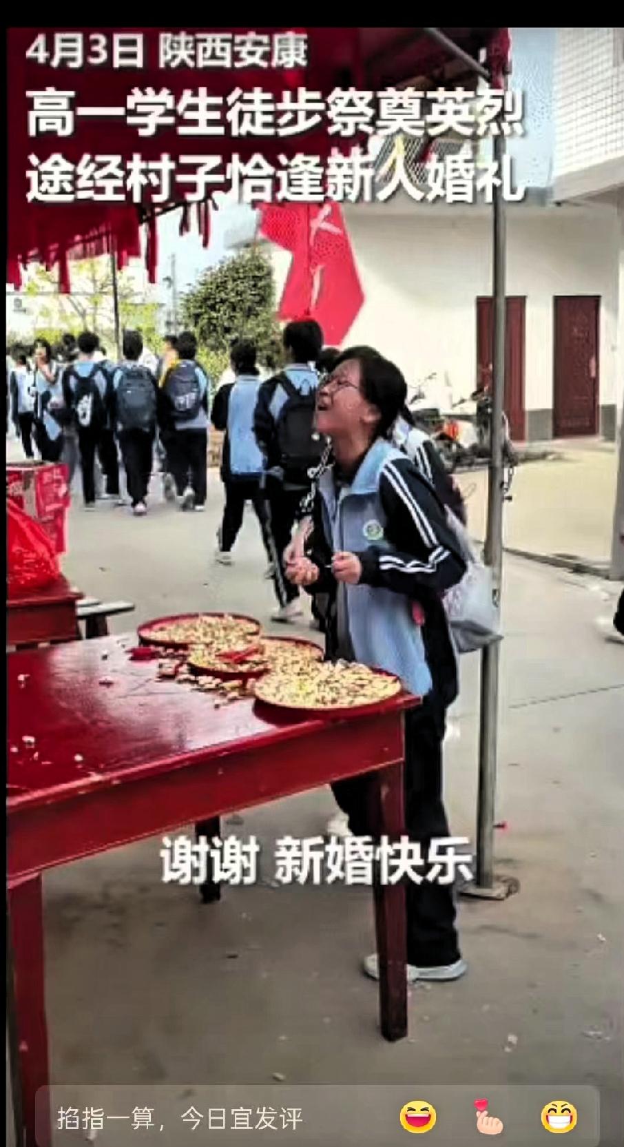 “火到人民日报了!”陕西安康,一对新人举办婚礼,谁知,就在婚礼即将结束时,刚好遇到高一学生徒步祭奠英烈, 两支队伍相遇,场面平和又暖心。 当天婚礼现场布置简洁喜庆,仪式临近结束时,列队前行的学生从附近经过。新郎看到后,主动安排亲友拿出喜糖和花生,分发给路过的学生。学生们有序领取糖果,也礼貌地向新人送上祝福,现场气氛融洽自然。 一场寻常的婚礼,一次庄重的缅怀之行,在不经意间相遇,没有冲突,只有互相尊重与善意。新郎在自己的喜庆日子里,愿意主动分享喜悦,体现了对少年学子的友好;学生们在祭奠英烈的途中,保持礼貌并回应祝福,展现了良好的素养。 这场婚礼没有追求奢华排场,却因这一细节更有价值。我们在享受安稳生活、举办人生喜事的同时,也不能忘记英烈的付出。幸福与感恩并行,喜庆与敬畏共存,才更显生活的踏实。 这样平凡又温暖的相遇,既传递了善意,也承载了对历史的尊重。很多网友表示,这才是值得提倡的文明新风,简单却有力量。 你觉得这样温馨有分寸的相遇,是不是最动人的风景?