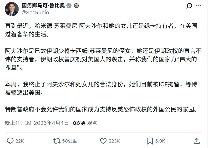 美国国务卿卢比奥发文撤销了伊朗已故少将苏莱曼尼的侄女和她女儿的美国绿卡,理由是二人是伊朗政权的支持者,并称美国是撒旦。二人目前被ICE拘留,等待被驱逐出美国。