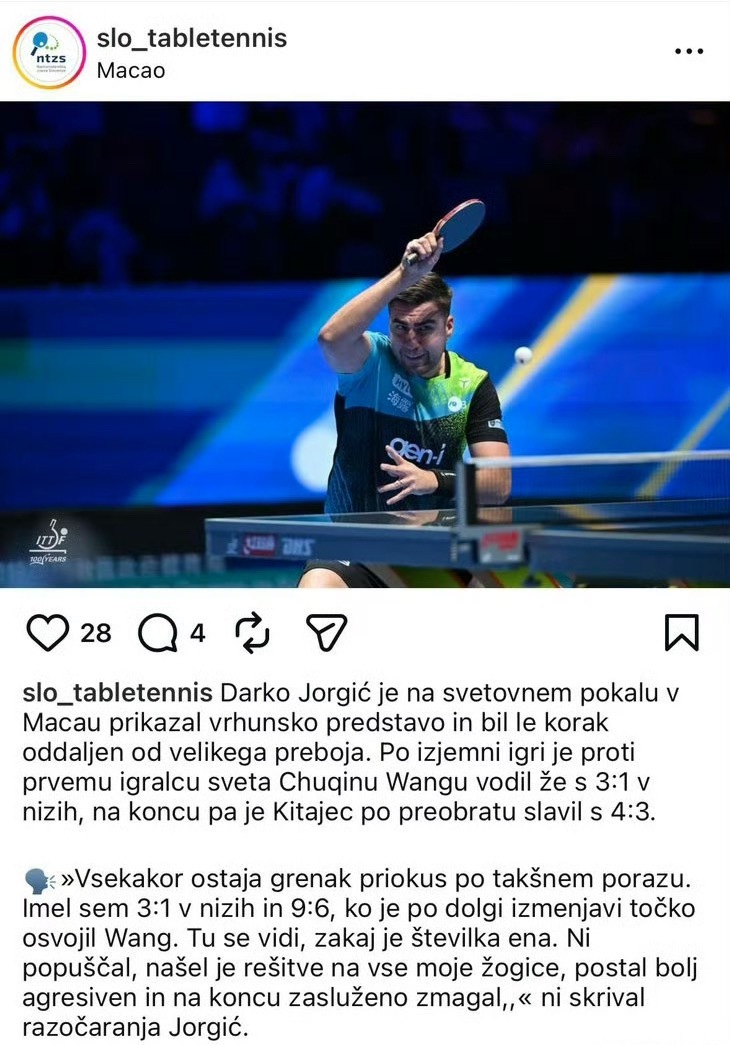 北京时间4月4日,2026年澳门乒乓球世界杯男单1/4决赛上演了一场足以载入乒坛史册的巅峰对决!世界排名第一的中国选手王楚钦,在大比分1-3落后、第五局一度濒临淘汰的绝境下,上演惊天大逆转,连扳三局以4-3(11-4、9-11、7-11、9-11、12-10、11-6、11-8)击败斯洛文尼亚名将达科·约奇克,惊险晋级四强。赛后,约奇克在采访中毫不吝啬地盛赞王楚钦,直言“输掉这样一场比赛留下苦涩遗憾,但那一刻你就能明白他为什么是世界第一,他的胜利实至名归”,这番发言瞬间引爆全网,让这场逆转之战的含金量再一次被全世界球迷见证。七局血战:从悬崖边到绝境重生,每一分都拼到极致