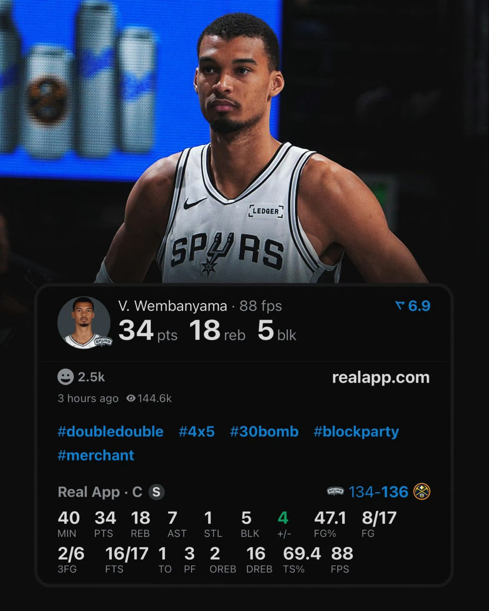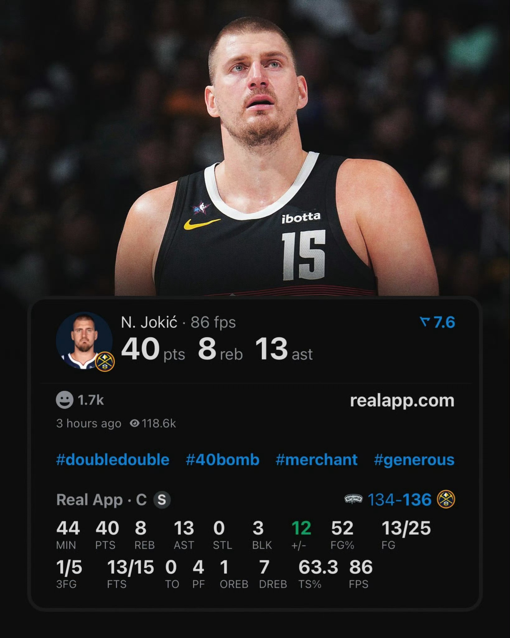 掘金136-134险胜马刺!约基奇40分三双0失误封神,双杀文班亚马终结11连胜