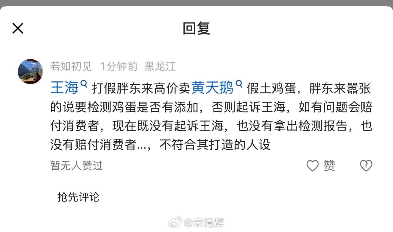 黑龙江网友留言 王海打假胖东来高价卖黄天鹅假土鸡蛋,胖东来嚣张的说要检测鸡蛋是否有添加,否则起诉王海,如有问题会赔付消费者,现在既没有起诉王海,也没有拿出检测报告,也没有赔付消费者…,不符合其打造的人设。于东来打压言论已无底线