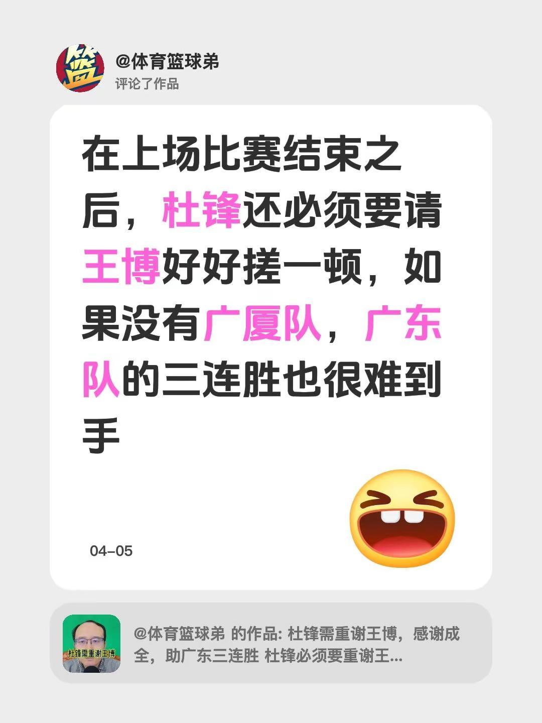 我评论了@体育篮球弟 的作品:在上场比赛结束之后,杜锋还必须要请王博好好搓一顿,如果没有广厦队,广东队的三连胜也很难到手