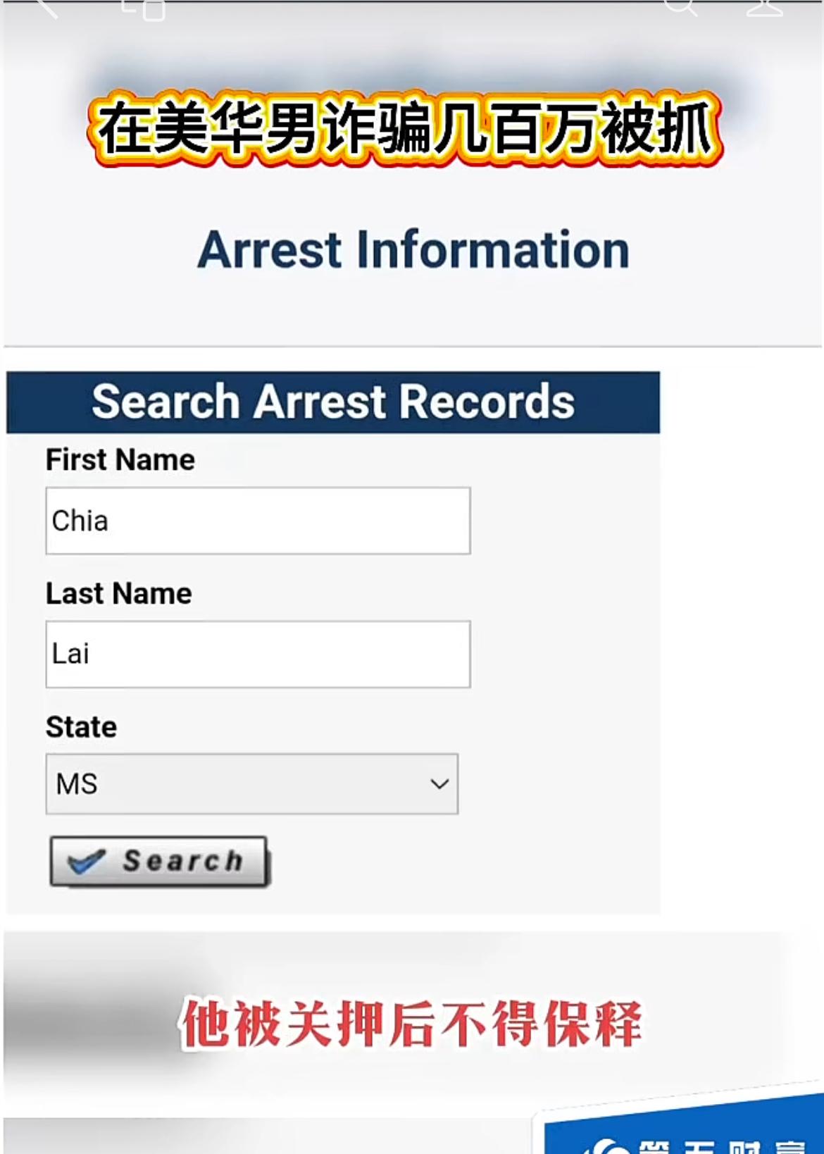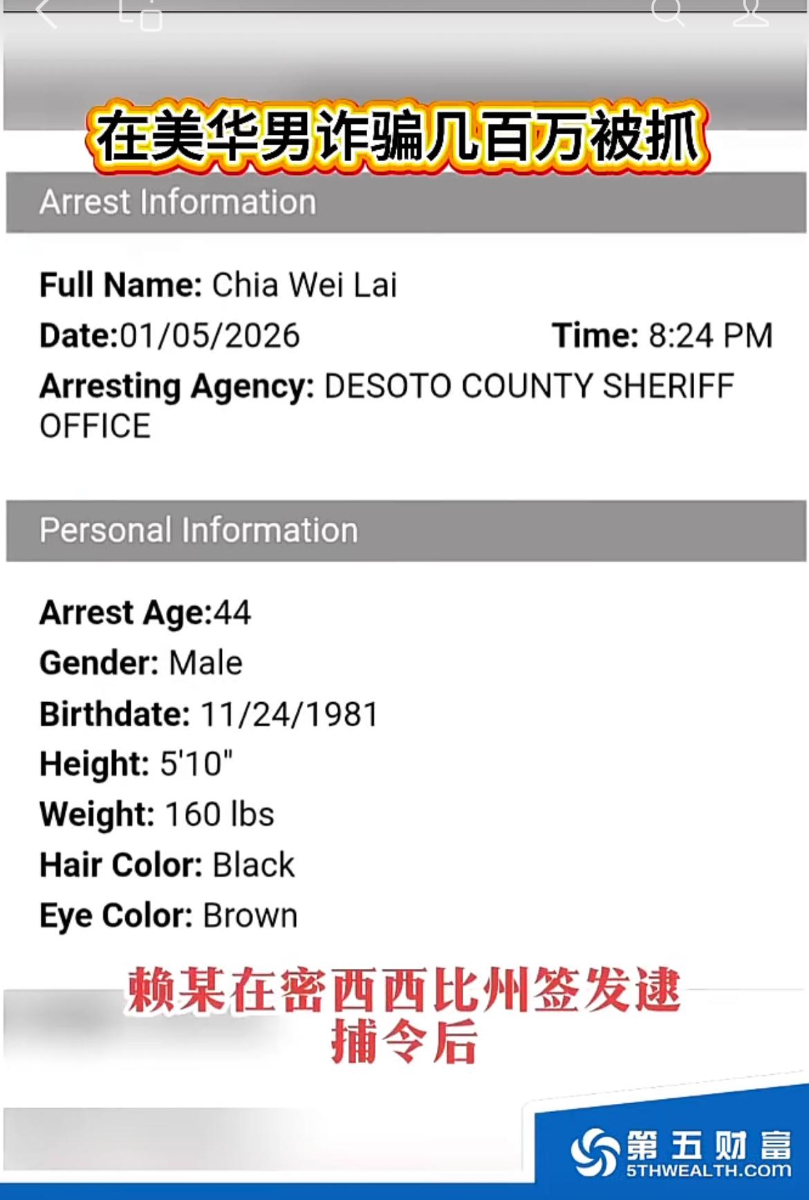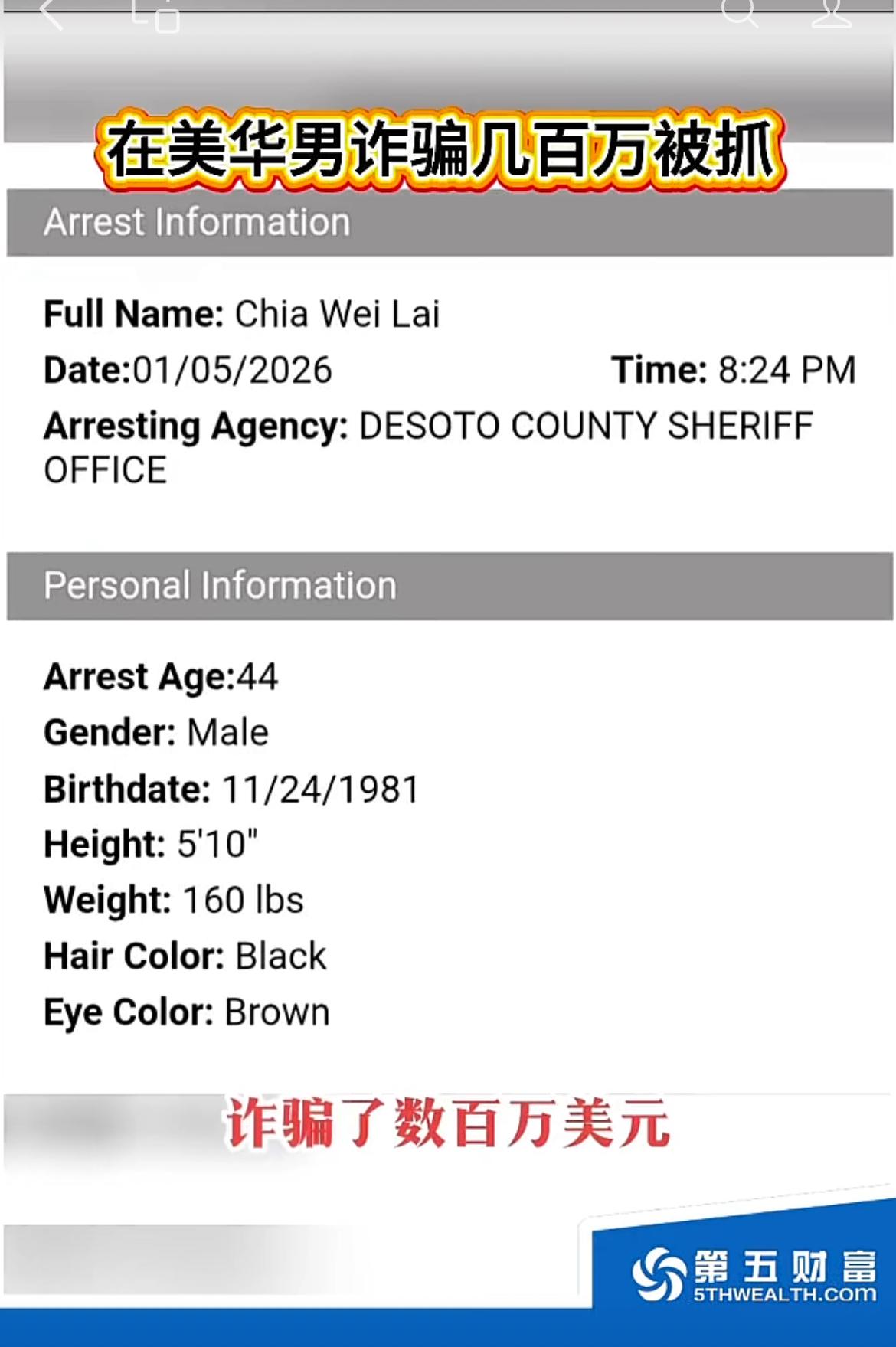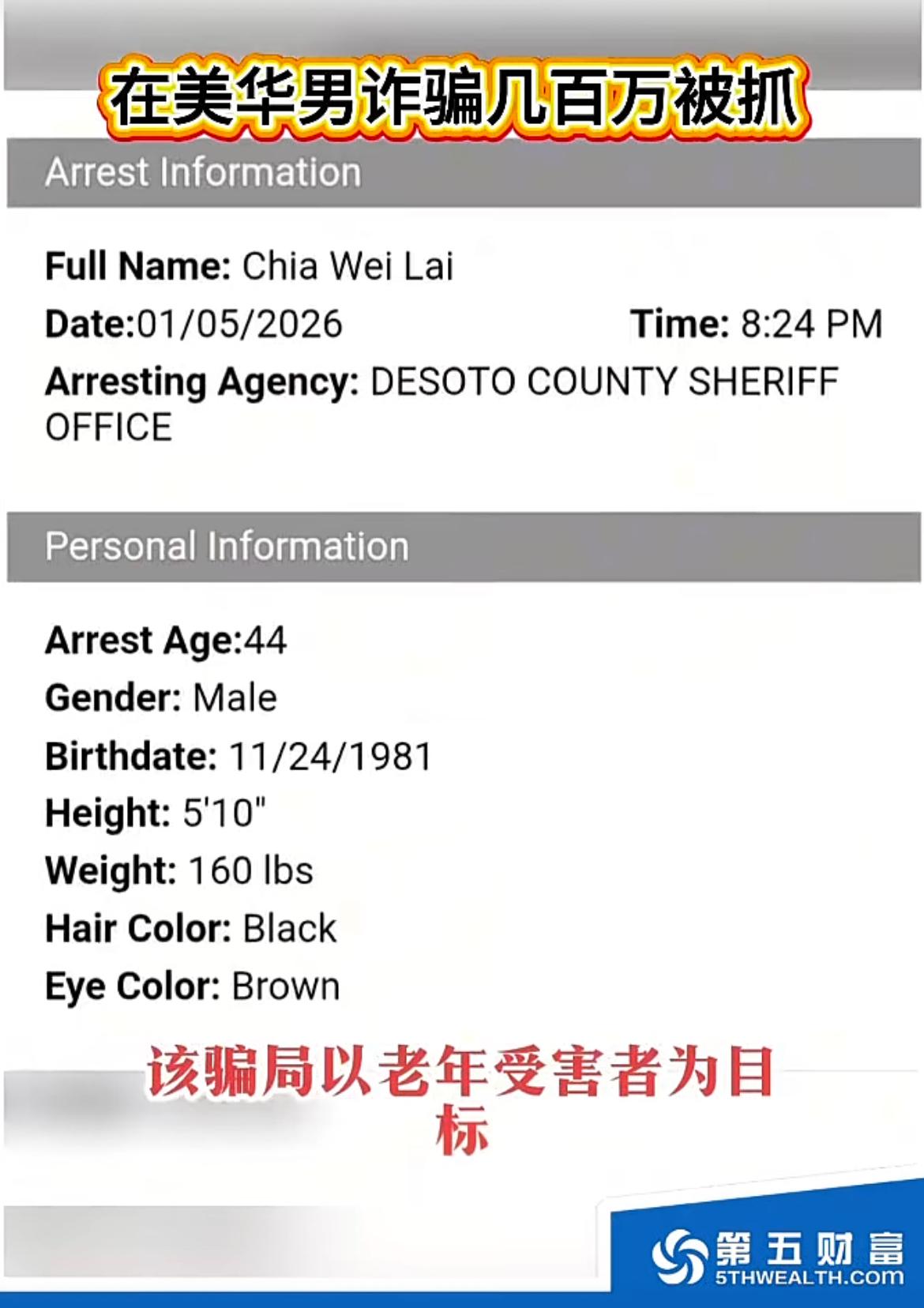 一名华人男子在美国搞杀猪盘,诈骗几百万美金准备逃回国,在洛杉矶机场被抓获。这名男子叫赖家伟,44 岁,2026年1月被美国密西西比州德索托县通缉。这名男子据信是有一个小型团伙,他们的主要目标是美国中部偏远州的独居高龄老人。通过社交媒体和这些老人进行交往,打感情牌与他们建立信任,再带他们进行虚拟货币投资,从而骗取钱财,很多老人的退休金都被他们一洗而光。东窗事发后,赖家伟准备潜逃回国,没想到美国警察行动迅速,在机场把他截留,他将面临涉嫌诈骗的刑事指控。