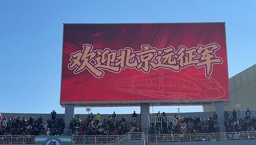 辽宁铁人俱乐部以及辽宁文旅对远道而来的北京球迷十分重视,打出标语进行热情欢迎,这也是东北人豪爽好客的体现。辽宁铁人俱乐部拉拉队在中场时与客队球迷进行友好互动,欢迎他们来到铁西体育场。