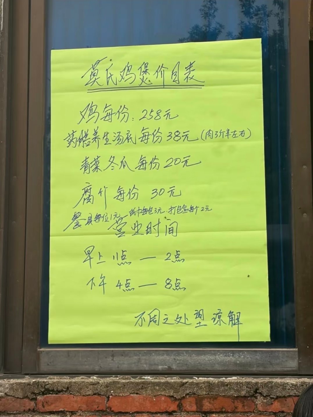 莫氏鸡煲老板儿子发声莫氏鸡煲已经开始限号了兄弟们,中午和晚上各100个号,现场取号、先到先得、不接受预订!门口还连夜挖了大的停车场,按照老板儿子说的按照现在食客的速度,再有一两个月养鸡场都要被吃光了,不知道到时候老板是不是就可以回归之前,一天10桌,卖完就去唱卡拉ok的生活…
