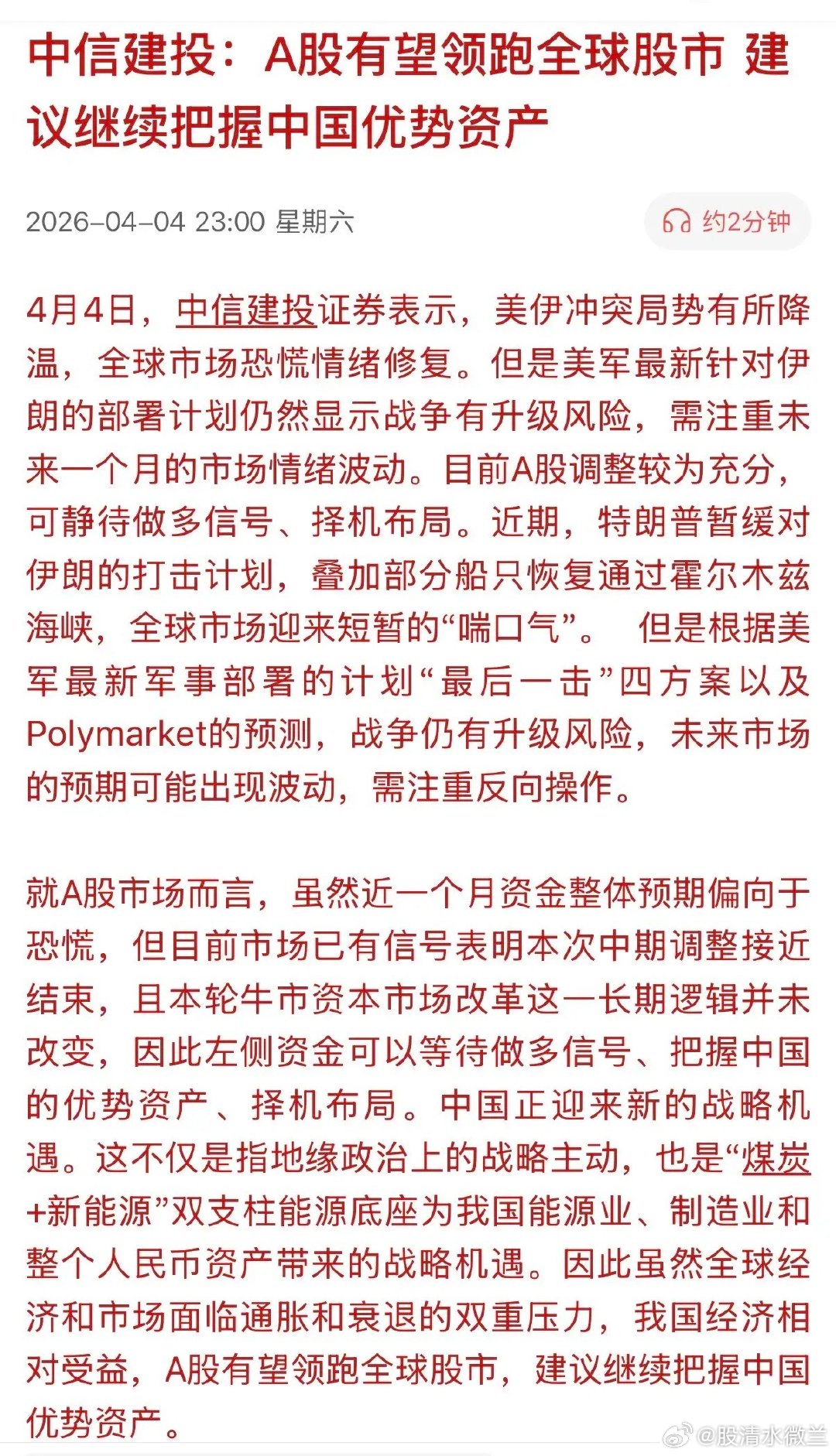 中国资产“硬核”!有知名券商表示,“A股有望领跑全球股市 建议继续把握中国优势资产”。其给出了充足的理由:一来A股调整充分;二来美以伊战争有缓和的迹象;三来全球经济和市场面临通胀和衰退的双重风险,而我们的经济相对受益!看上去非常有道理,事实反映到市场,却恰恰相反,A股跌跌不休,不知道何时才能止跌。反观欧美市场,虽然市场受到了美以伊的侵扰,但是总体指数依然保持高位。一旦战争结束,欧美股市就像坐火箭似的,蹭蹭往上涨。而A股又会怎么涨,投资心中都有杆秤!