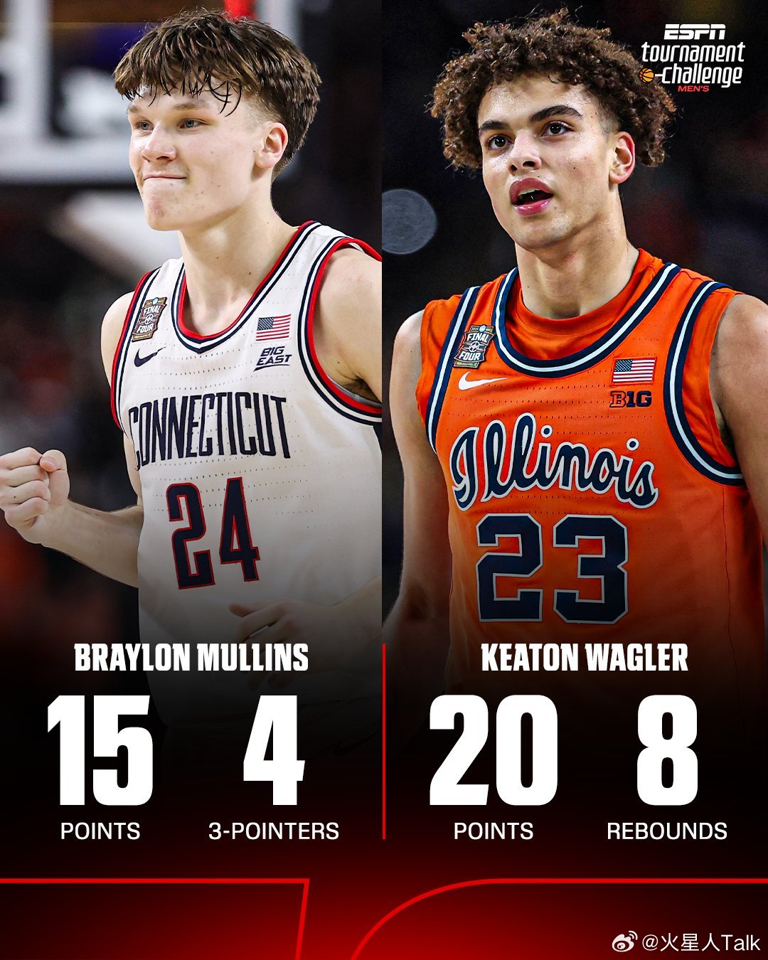 2025-2026赛季NCAA男篮疯狂三月 半决赛康涅狄格大学击败伊利诺伊大学,四年三进决赛。Keaton Wagler和Braylon Mullins成为自1982年迈克尔·乔丹和帕特里克·尤因之后,第一对在四强赛中拿到15分的菜鸟新生。哈士奇Tarris Reed Jr12中6,17分11篮板Braylon Mullins14中5,15分2抢断。Alex Karaban8中1,三分球7中1,9分4篮板4助攻。Silas Demary Jr8中2,7分9篮板7助攻。Solo Ball11中5,13分。替补Jayden Ross4中2,7分3篮板。伊利诺伊人Keaton Wagler16中7,20分8篮板2助攻3失误。Tomislav Ivisic11中4,16分7篮板2失误。David Mirkovic和Kylan Boswell各得6分。替补Andrej Stojakovic10中4,9分8篮板。