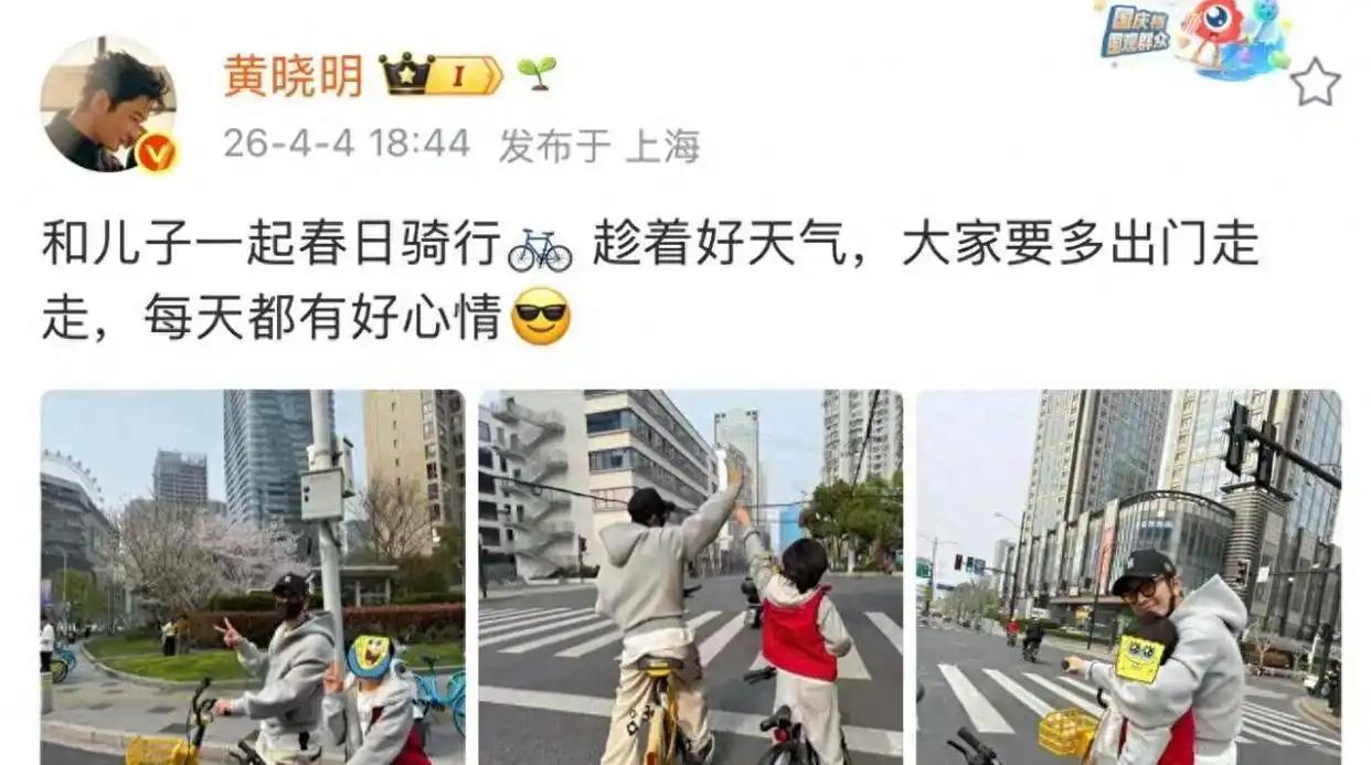9岁小海绵快有爸爸高了! 黄晓明骑行照曝光,感情现状成谜 身家过亿的黄晓明,清明假期被拍到骑着共享单车带儿子出门。 9岁的小海绵骑着一辆黑色自行车,眼尖的网友立刻扒出品牌和价格——1299元。