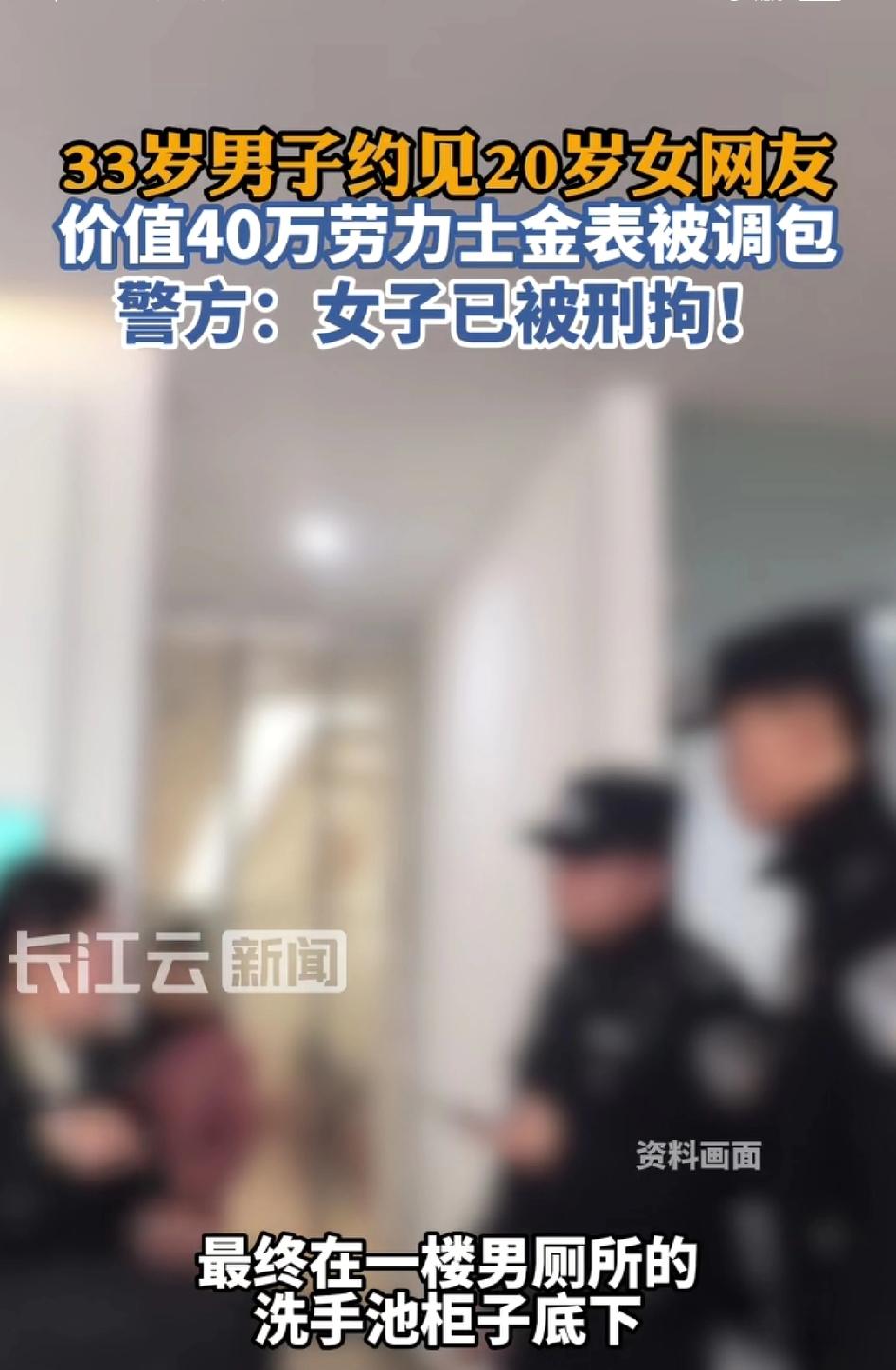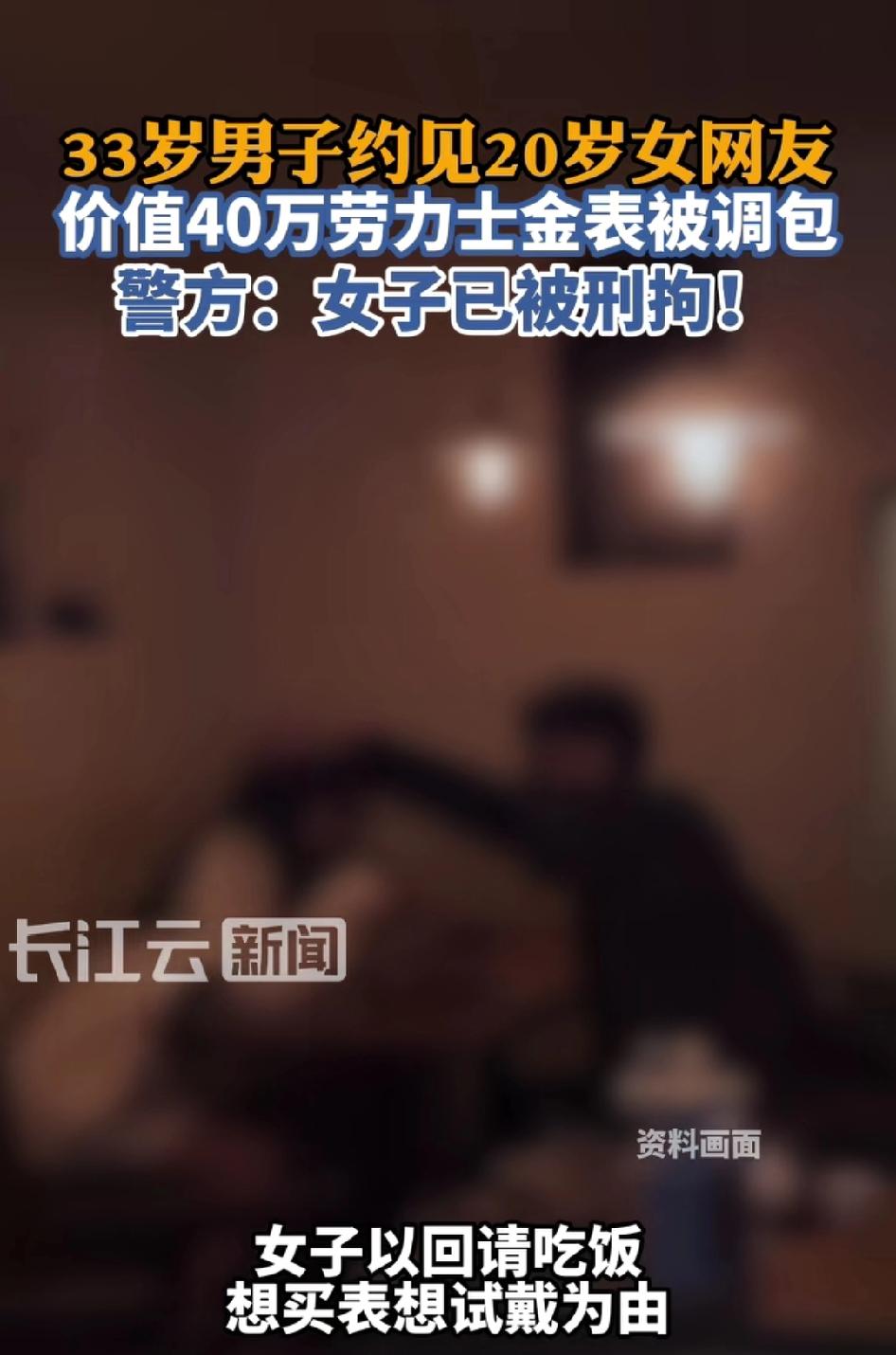 “狸猫换太子”!北京一名33岁男子经女网友邀约,戴着价值40万的劳力士赴约。席间男子出手阔绰,女子见状心生贪念,借机近距离查看手表,趁其不备用网购的300元高仿表悄悄调包,男子事后才发现被骗,立即报警。藏表的地方更是让人想不到。 33岁的刘先生,平时喜欢收藏名表,经常在社交平台分享自己的腕表。他家境不错,手上这块劳力士日志型金表,是他心爱的收藏,市场价值近40万。 20岁的修某,在网上关注了他很久。 她看着刘先生晒出的一块又一块名表,心里渐渐起了念头。她没有稳定工作,日子过得普通,却对奢侈品格外向往。看着屏幕里闪闪发光的金表,一个大胆又危险的计划,在她心里慢慢成型。 为了这次见面,她足足准备了三天。 她花300元,网购了一块同款高仿劳力士,反复翻看刘先生发过的视频,逐一对细节:表盘、钻刻、表带松紧、甚至佩戴痕迹。她还特意拆下两节表带,让假表和真表看上去一模一样。 一切准备妥当,她主动约刘先生吃饭。 怕他不肯来,她还特意说:上次你请我,这次我 回请你,顺便给你带了小礼物。 她花近1000元买了礼物,就是为了让刘先生放下戒备,相信她只是普通朋友见面。 刘先生没有多想。 他觉得对方年纪小,又是女生,说话也客气,完全没往坏处想。赴约时,他还特意带了几块名表,想着让对方试戴参考,完全是一片真诚。 饭桌上,气氛还算轻松。 修某笑着说:我一直挺喜欢这款表,能不能借我戴一下看看效果? 刘先生没犹豫,顺手就把金表摘下来,递给了她。 他不知道,这一递,就是一场圈套。 修某把表戴在手上,一边和他聊天,一边假装欣赏。 趁刘先生低头看手机、注意力分散的一瞬间,她手指飞快,不动声色就把真表和假表换了过来。动作快到几乎看不见,表情依旧自然,像什么都没发生。 得手后,她起身说去趟洗手间。 走进厕所,她拿出提前准备好的抹布,把真表仔细裹好,塞进男厕所洗手台下方的柜子夹缝里。 她觉得,女生一般不会进男厕,别人更不会往最不可能的地方找,等刘先生走了,她再回来取走,神不知鬼不觉。 回到座位,她把假表还给刘先生,依旧笑着说话,语气平静,看不出一点异样。 刘先生把表戴回手上,刚一低头,就觉得不对劲。 质感不对、重量不对、细节也不对。 他心里咯噔一下,再仔细一看,瞬间明白:自己被调包了。 他没有当场发作,只是平静地说:这表不是我的,你把我真表拿回来吧。 修某脸色微变,一口否认,说自己根本没动过。 刘先生不再多说,直接拿出手机报了警。 民警很快赶到,现场一问,修某的话前后矛盾,神色慌张。 民警判断,表肯定还在餐厅里,没有被带出去。 他们一层一层、一个角落一个角落找,最终在一楼男厕所的柜子底下,找到了那块被抹布裹住的真劳力士。 与此同时,警方调取了她的网购记录,买高仿表的订单清清楚楚;又在她住处找到拆下的表带。 面对监控、赃物、订单三重证据,修某的心理防线彻底垮了,慢慢说出了整个策划过程。 她才20岁,本来有大把人生可以走正路, 却因为一时贪念,把自己送进了看守所。 目前,修某已被北京朝阳警方依法刑事拘留,案件还在进一步办理,等待司法机关的审理和判决。 这件事看着像电影桥段,却真实发生在我们身边。 它戳中了一个很现实的痛点: 网络交友越来越普遍,可人心隔层屏幕,你永远不知道,对你笑的人,心里在盘算什么。 有人晒的是生活,有人盯着的,却是你的财物。 贵重物品外露,容易引来贪心; 过度信任他人,容易埋下危险。 真诚没有错,但善良要带点防备; 交友没有错,但识人要看清底线。 人生最傻的,不是没钱, 是为了一点虚荣,赌上自己的一生。 消息来源:网络公开内容,本文配图/视频素材来自网络,仅用于纪实分享与社会观察,如有侵权请联系删除,谢谢!