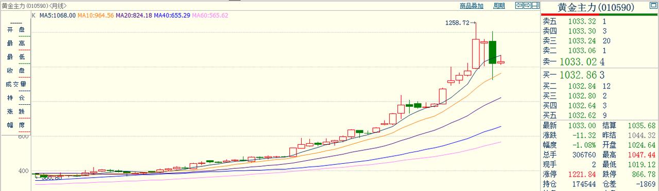 今天是4月5日, 回顾一下, 刚刚过去的三月份, 国内黄金期货大幅下跌。 如下面的主力合约 月线图,可以明显看出: 三月份黄金主力合约 收于近几个月来, 首次大阴线,快速下跌。 但其实是连续第二个月下跌。 虽然从图形看, 回调压力比较大, 但是期货小褚认为未来有望 止跌企稳,快速反弹!