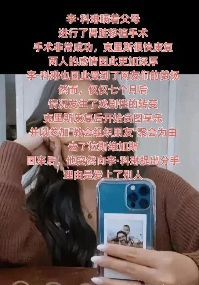 华裔女孩为爱捐肾给白人男友,生死相依的关系却在 10 个月后惨被抛弃。这名华裔女孩叫柯林李。她的男友叫克里斯。华裔女孩是一名网红,和她的男友克里斯非常的恩爱。 克里斯有一个毛病,从 17 岁开始就身患慢性肾病,和科林李交往的几年里肾病越来越重,医生告知如果不及时换肾可能面临生命危险。 很巧合的是科林李的肾竟然和男友配对成功,经过一番思想斗争,科林李选择捐一个肾给男友,挽救他的生命。手术非常顺利,克里斯几个月后就康复出院。 这一出为爱捐肾给男友的感人爱情故事,在全美引起了巨大的轰动。没想到好景不长,克里斯突然向科林里提出分手,他说自己爱上了另外一个女人。 克里斯在对科林李的辩白中说:如果上帝想让我们在一起,那一定有一天会安排我们重聚。科林里非常的伤心,但也不得不放手。没想到克里斯继续补刀,来了一句:你的举动不过是让你看起来像一个好人。留言真的是冷血又扎心,把一个白男冷漠、自私、无耻的嘴脸展现的淋漓尽致。