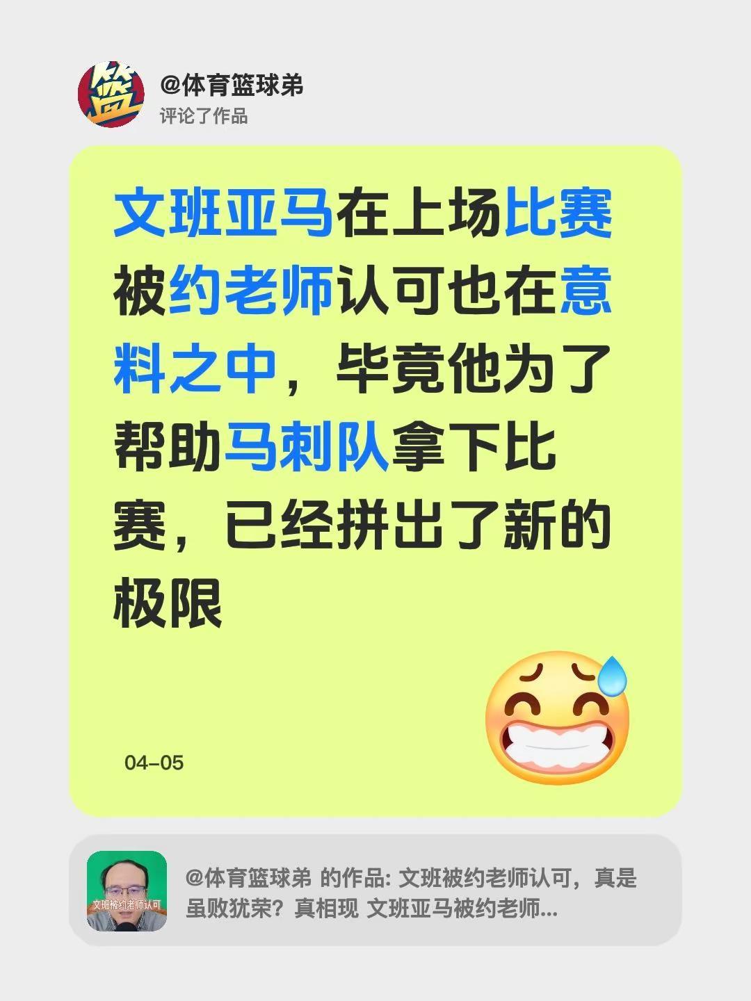 我评论了@体育篮球弟 的作品:文班亚马在上场比赛被约老师认可也在意料之中,毕竟他为了帮助马刺队拿下比赛,已经拼出了新的极限