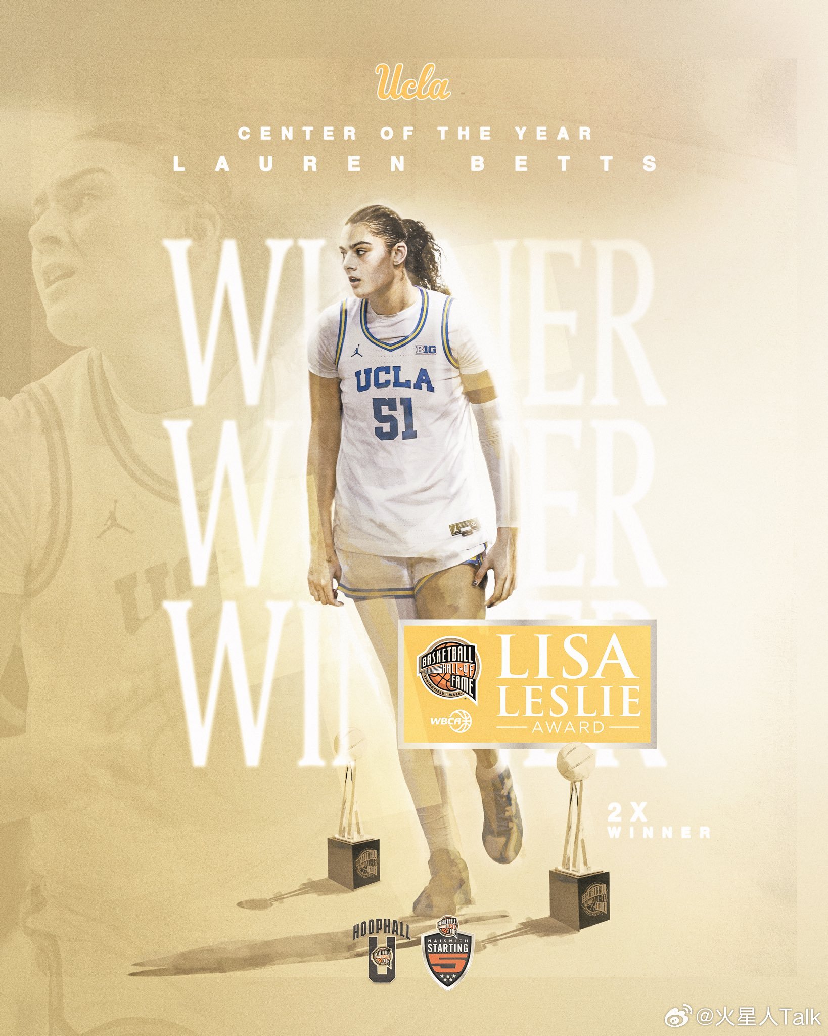 NCAA女篮 2026年奈史密斯大学女子篮球丽萨·莱斯利奖(年度最佳中锋):Lauren Betts,加州大学洛杉矶分校。
