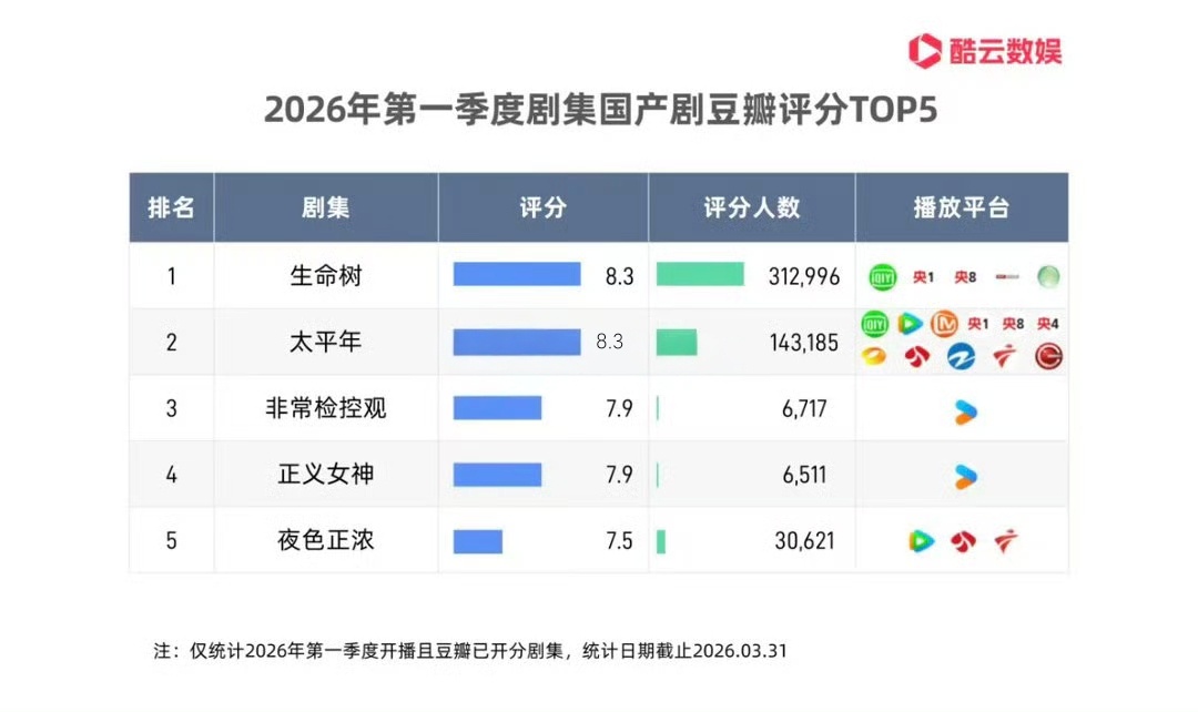 2026年第一季度剧集国产剧豆瓣评分TOP5,生命树评分数量+分数都是top1
