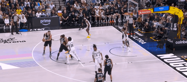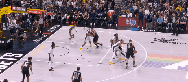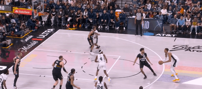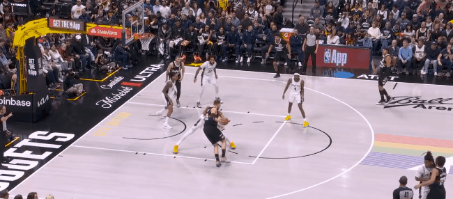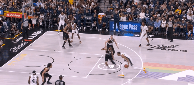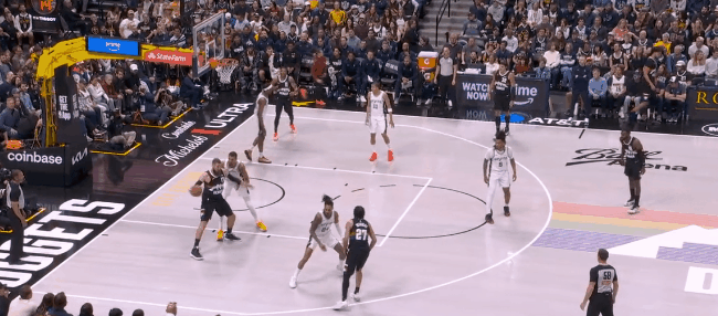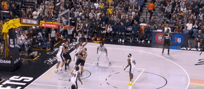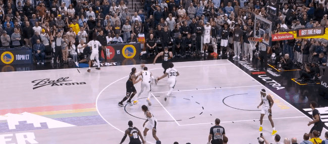 然而文班亚马的终极错位开始统治比赛:回了一个拖车远射。约基奇退防时已经指了,但对文班这高度,等于是空位三分。第二节开始半分钟,文班已经9个罚球:掘金不用约基奇对他了,半绕前合围。于是哈珀和福克斯利用文班在弱侧/拖车的空位反击上篮,文班再面筐突分巴恩斯,领先到12分,打停掘金。