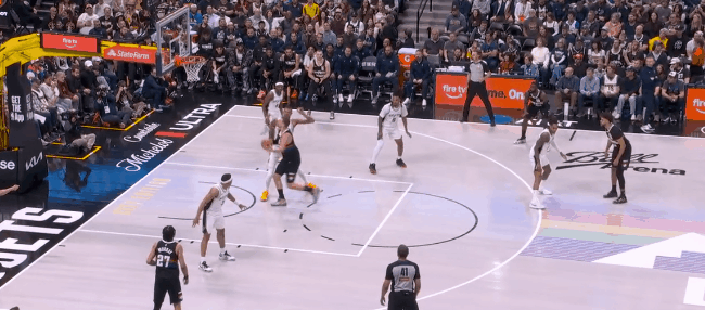 领先9分了,约基奇归来。开场约基奇曾靠肩臂推开过文班背吃得手。下半场他不去禁区背吃了,但肩臂还能用嘛——弧顶接球,顺势左手推开文班,抛射:文班出禁区,马刺禁区没人了。约基奇和戈登的45挡拆,尚帕尼也知道自己干扰不了约基奇,延阻后返位,等文班去对约基奇:一个时间差,约基奇又中投得手。约基奇又找卡斯尔突破,吸了夹击,喂给穆雷远射。约基奇底角扛着瓦塞尔走,等福克斯来夹击,立刻喂卡约三分。于是终于到了比赛最后:约基奇走位接球,文班和尚帕尼合围,约基奇直塞篮下,戈登扣篮,拖进加时赛。