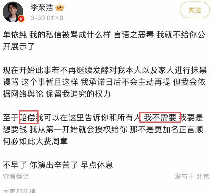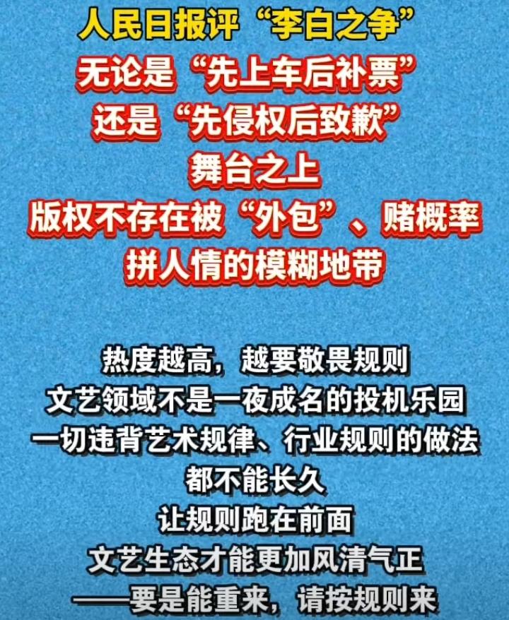 人民日报发声,李荣浩赢了。 对于李荣浩和单依纯的《李白》之争,人民日报正式发声。 舞台之上,版权不存在被外包、赌概率拼人情的模糊地带,热度越高,越要敬畏规则,一切违背艺术规律、行业规则的做法,都不能长久。 实际上,《李白》的版权问题,一开始的赢家就是李荣浩,也不存在输赢,李荣浩拒绝向单依纯授权,但后者在演唱会上还是唱了,这就是属于知法犯法。 人民日报发声,不是要判定李荣浩和单依纯的输赢,而是向公众告知音乐版权归属权的重要性,尊重原创的利益,也是一位音乐人最起码的认知。 其实《李白》事件之后,频频曝出音乐版权的翻车现场,比如音乐《后会无期》,徐良演唱会大屏幕上写着作词作曲徐良,徐良非常生气,为什么不把汪苏泷名字写上去,随后给汪苏泷道歉。 两人是多年的好朋友,优秀的音乐人,友情的存在,也许汪苏泷不会计较,但徐良知道版权归属的重要性,这就更加深刻的说明版权的重要性,这不是说说而已,而是受法律保护。 李荣浩和单依纯,单依纯愿意道歉个赔偿版权费,但李荣浩没有接受,毕竟他想要的是让对方知道版权的重要性,而不是钱,李荣浩也说了,如果自己想要钱,一开始就会授权对方演唱。 因此,尊重原创是音乐人的重要认知。