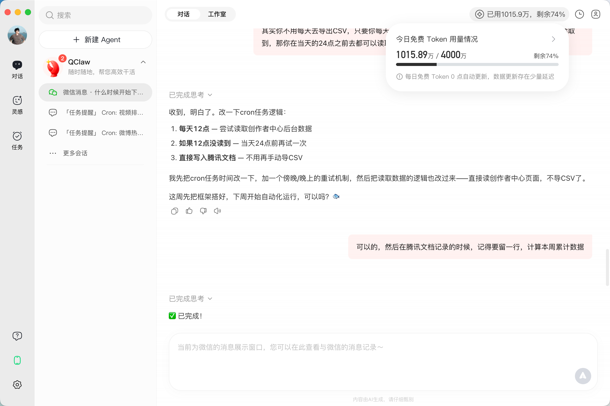 当天Token消耗完毕就直接下班不接受任何信息从这点看好像还是人的性价比高点openclaw