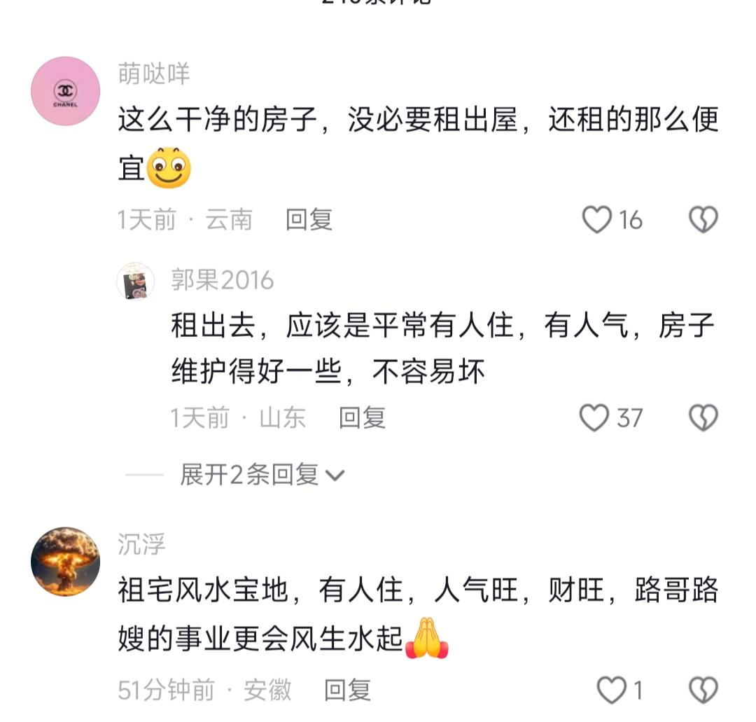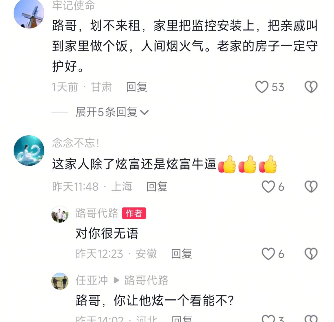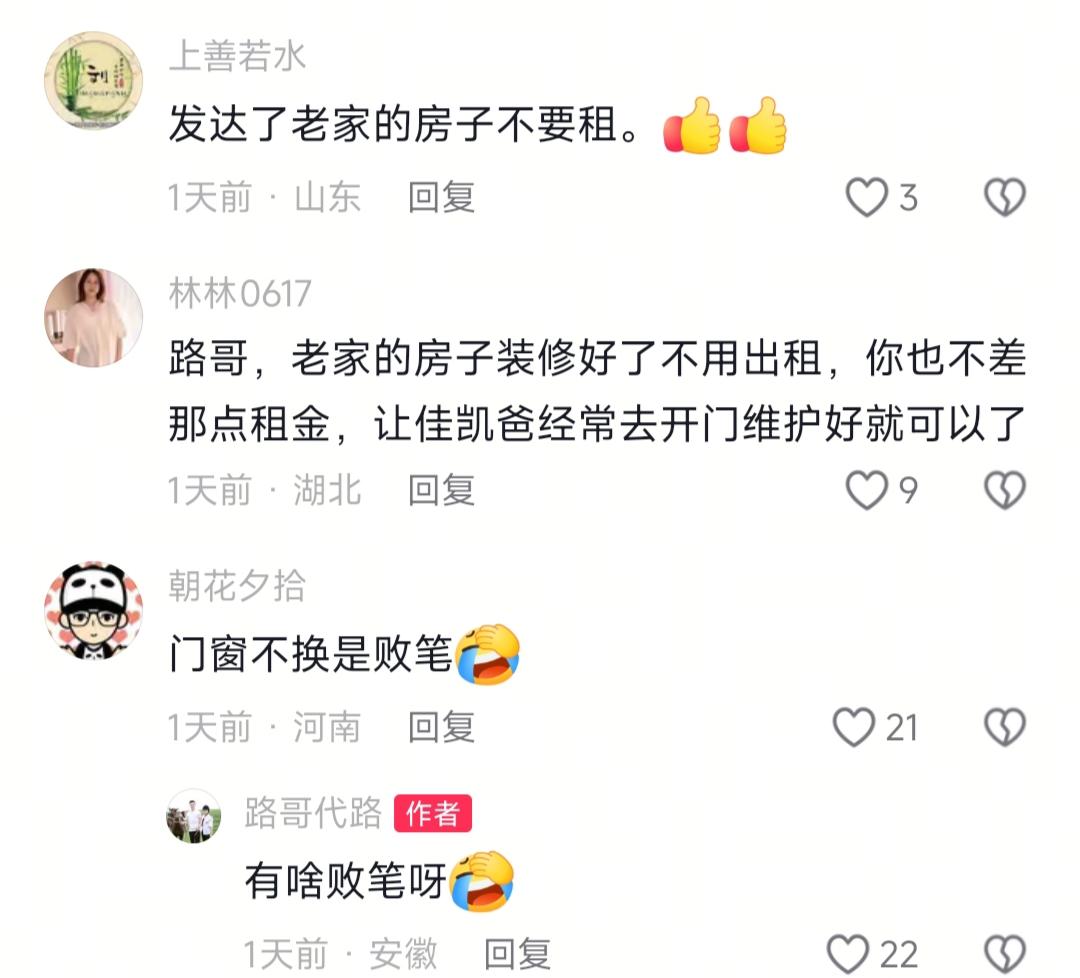 现在全网最无语的网红就是路哥了吧! 不是因为祖宅没修好,也不是因为租金没赚到 而是因为好心修房低价出租,反倒被骂炫富,我真服了了 家人们谁懂啊!,说真的,刷到路哥路嫂这条界首老家修房的视频,我直接和小伙伴都惊呆了!本来以为又是网红回乡的老套路,结果看完内容反转,评论区直接吵翻了天,我越看越有感触,忍不住来跟大家唠唠。 说真的,我本来想一划而过,结果越看越上头。路哥对着镜头说界首老家的房子全收拾好了,要回去看看,路嫂当场就掏了一沓现金出来支持,这也太给力了吧!然后路哥回了老家,表哥早就在门口等着了,路边的大蒜都给他看乐了,念叨着小时候常吃,这不就是我们回老家见着老物件的样子嘛。 老实讲,我前两年也想翻修老家的老房子,结果找的施工队不靠谱,钱花了小两万,活干得稀碎,墙刷得坑坑洼洼,水电也没弄好,最后给我整崩溃了,这事到现在都郁闷。所以看到路哥这房子修得明明白白的,真的慕了:棚子换成了玻璃的,墙刷得干干净净,地砖铺得整整齐齐,厨房煤气罐、抽风机全换新,洗手间马桶、水电全给搞掂,二楼一开灯敞亮得很,开窗就是山,空气绝了,巴适得板! 然后路哥对着镜头说,父亲三年前离世了,这次把房子修好,打算租出去,就找干净利索的人家,四五百块钱一个月都行,租金随便。转头他就把一万六千多的修房款亲手交给表哥,还一个劲地道谢,说房子修得太合心意了。 不是吧?就这也有人骂?评论区直接炸了:有人说这么好的房子没必要租,还租这么便宜;有人说祖宅有人住才聚人气,有人住财气才旺;有人说不差那点租金,找人定期维护就行;还有人张嘴就说人家除了炫富还是炫富,路哥直接回了句“对你很无语”,我都替他憋屈。别人说的老房子讲究个烟火气,空久了就失了生气,有人住才有魂,这话真不是胡扯。 总之啊,我想说的是,真没必要拿着放大镜挑别人的毛病,要是你家也有老家的老房子,别让它就那么荒着,常回去看看,哪怕收拾收拾给需要的人住,也比空着强。你说是吧?路哥代路