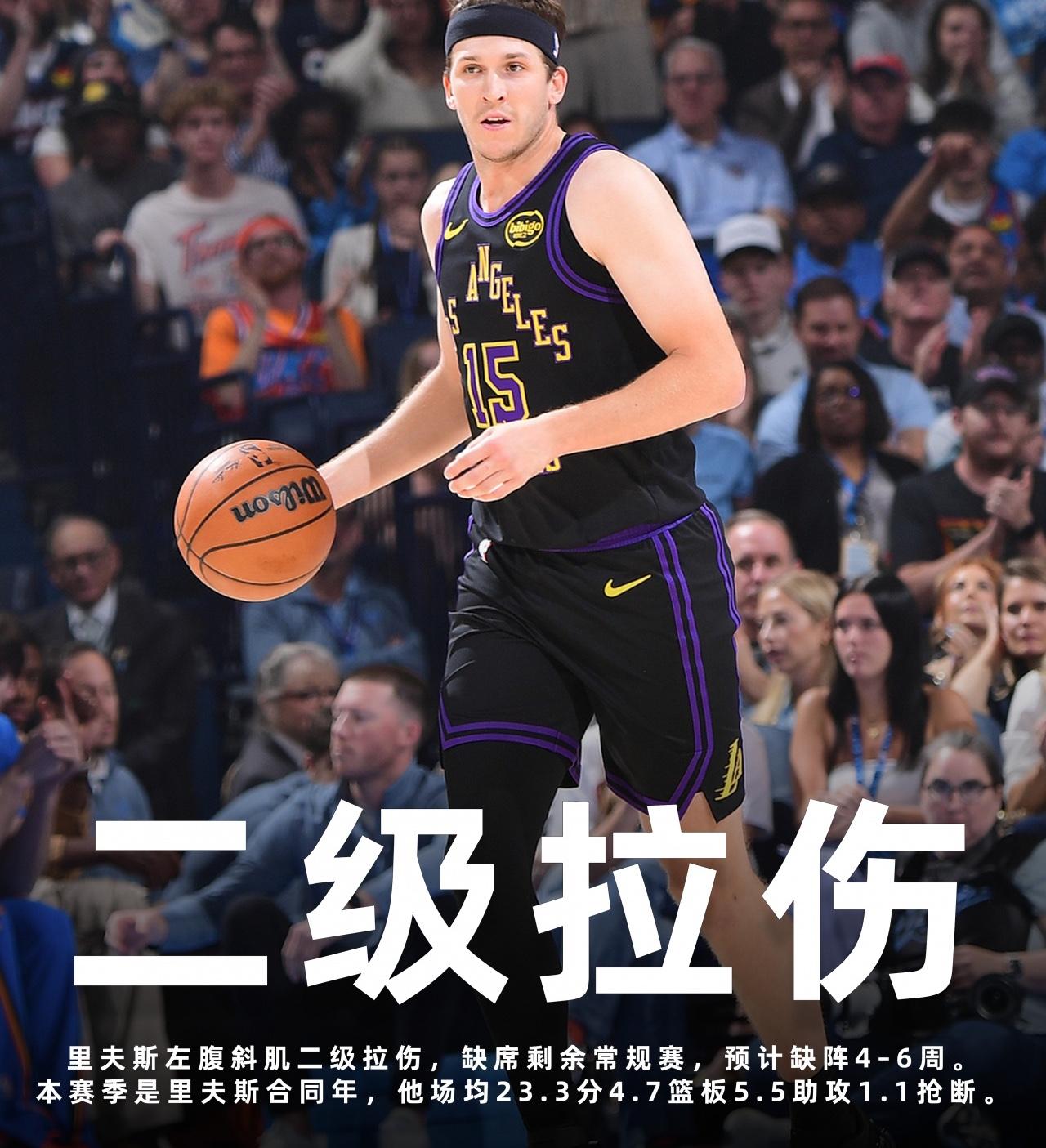 完了完了完了!湖人又遭遇噩耗,他们真的是雪上加霜昨天。 湖人昨天官方刚刚宣布,东契奇因为腿筋拉伤,将缺席剩余的常规赛,甚至季后赛首轮他都无法复出。今天又传来一个噩耗,球队的三当家里夫斯左侧腹斜肌拉伤,将缺席4~6周,剩余的常规赛也将缺席,能否赶上季后赛首轮也不确定。 现在在下湖人队就剩下41岁的詹姆斯了,这也到了他单核带队的时候,能否带领湖人闯过首轮,正是考验詹姆斯的时候了。话说回来,如果詹姆斯真的能一人带队帮助湖人闯过首轮可以说就是这赛季就是成功的。 现在东契奇,里夫斯全部受伤,西部的其他豪强或许都把目光瞄准了湖人,如果首轮能对上湖人,或许这正是他们想看到的。