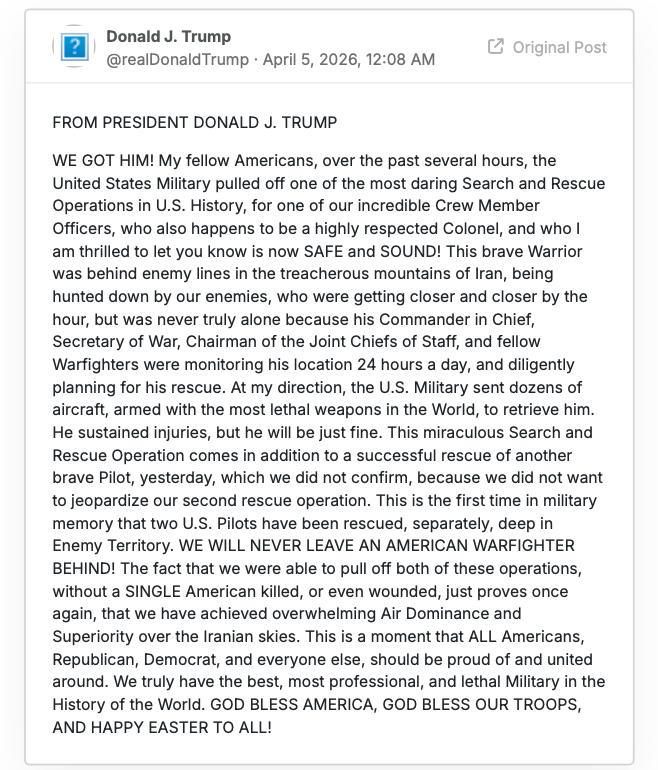 特朗普在12时08分所发的帖子:确认美国第二名飞行员获救!内容如下:“来自总统唐纳德·J·特朗普。我们找到他了!我的美国同胞们,在过去的几个小时里,美国军方完成了美国历史上最勇敢的搜索和救援行动之一,救出了一位令人难以置信的机组成员军官,他还是一位备受尊敬的上校,我非常高兴地告诉你们,他现在安全无恙!这位勇敢的战士曾在伊朗险恶的山区敌后,被敌人追捕,敌人每小时都在逼近,但他从未真正孤单,因为他的总司令、战争部长、参谋长联席会议主席以及其他战友们全天24小时监控他的所在地,并认真策划他的救援。在我的指示下,美国军方派出了数十架装备世界上最致命武器的飞机去营救他。他受了伤,但会没事的。这次奇迹般的搜索与救援行动是在昨天成功救援另一位勇敢飞行员之后进行的,当时我们没有确认,以免危及第二次救援行动。在军事记忆中,这是美国两名飞行员首次在敌方领土深处被分别成功救援。我们永远不会落下任何一位美军战士!我们能够完成这两次行动,没有一名美国人死亡,甚至没有受伤,再一次证明了我们在伊朗上空取得了压倒性的空中优势和制空权。这是所有美国人——无论共和党人、民主党人还是其他人——都应该为之自豪并团结的时刻。我们确实拥有世界历史上最优秀、最专业、最致命的军队。上帝保佑美国,上帝保佑我们的部队,复活节快乐!”
