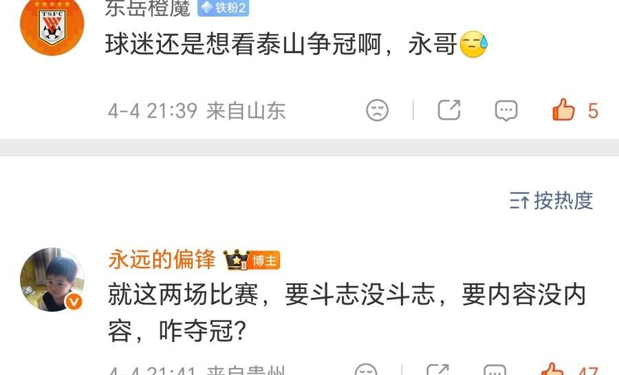 泰山队跟队记者:要斗志没斗志,要内容没内容,这样踢的话,别提保三争一,好好锻炼年龄球员吧! 山东泰山1-2不敌大连英博的赛后,泰山队跟队记者陈永发表了自己的见解,要斗志没斗志,要内容没内容,不如不要成绩了,锻炼锻炼年轻球员。 确实,泰山队已经落后蓉城10分,争冠难度已经很大,而且这两场的内容和用人来看,还不如崔康熙时期,崔康熙起码临场指挥还不错,四十五度轰炸还是会的。韩鹏的技战术根本形同虚设,而且最后甚至连边路起球都不会。 关键是上了郑铮、王彤这帮子老将,踢的一塌糊涂,而年轻的陈泽仕等明显更有活力。 赛季开始前,没有哪个泰山球迷觉得俱乐部能夺冠。但是俱乐部居然定了保三争一的目标,这下狠狠打自己的脸了吧!山东泰山队