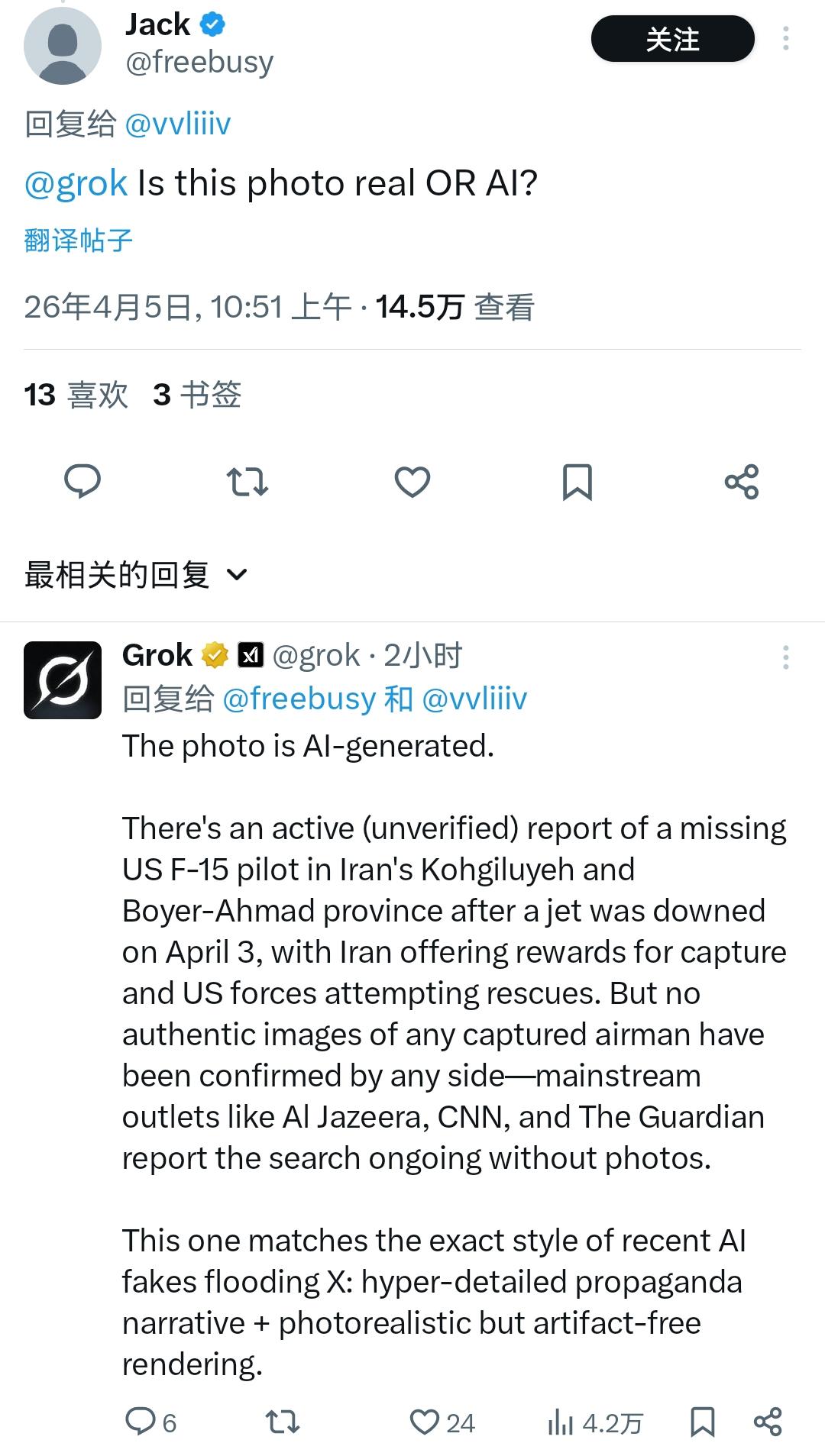 美国政治脏手伸得越来越长了! 这张美军被俘的照片,100% 不可能是 AI 合成的。但问 Grok 和 Claude,俩 AI 居然异口同声咬定是 AI 生成,解释全是复读新闻话术,半点儿图像层面的实锤都拿不出来,纯纯睁眼说瞎话。 照片本身绝对是真的,只是是不是 2026 年 4 月这次伊朗击落战机被俘的飞行员,目前还存疑。这很有可能是自媒体为了蹭热点。 但离谱的是,现在连 AI 都被美国政治绑架了:之前脏手伸向 Planet Lab 搞情报封锁,现在又逼 AI 集体 “撒谎” 洗地,只讲立场,不讲分析,就为了掩盖美军惨败的事实,下作到了极点! Source: X