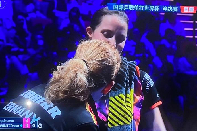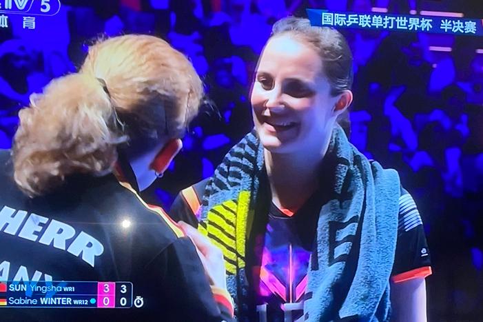 昨天莎莎把汗娜高达打哭了, 今天,莎莎竟然把温特打笑了🤭 女单半决赛,温特0:2落后孙颖莎,局间休息时,温特和场外指导对话 教练:温特再挺挺! 温特:怎么挺? 教练:拿出昨天打王艺迪选手的气势。 温特:教练姐姐,莎莎和王艺迪可不一样, 教练:怎么讲? 温特:我打王艺迪她一个心眼,就是跟我硬拼,可是,孙颖莎不一样,我都不知道下个球她的落点在哪里,防都没法防 教练:别着急,盼着莎莎失误吧! 温特:你看她的眼睛都瞪圆了,精神着呢,还能失误? 教练:那现在你跟我要办法,我也没有,你只能自己发挥了。 听了教练的话,温特无可奈何地摇了摇头,笑了,这简直就是苦恼人的笑。 澳门世界杯,国乒选手孙颖莎4:0横扫德国怪球手沙宾.温特,强势挺进决赛,孙颖莎成功地为队友王艺迪复了仇(沙宾温特1/4决赛,4:0横扫了王艺迪,职业生涯首次进入世界杯赛四强行列) 打进决赛的孙颖莎将同队友王曼昱争夺冠亚军。不管谁夺冠,冠军都是国乒的 迄今为止,国乒已经提前囊括澳门世界杯女子单打冠亚军。