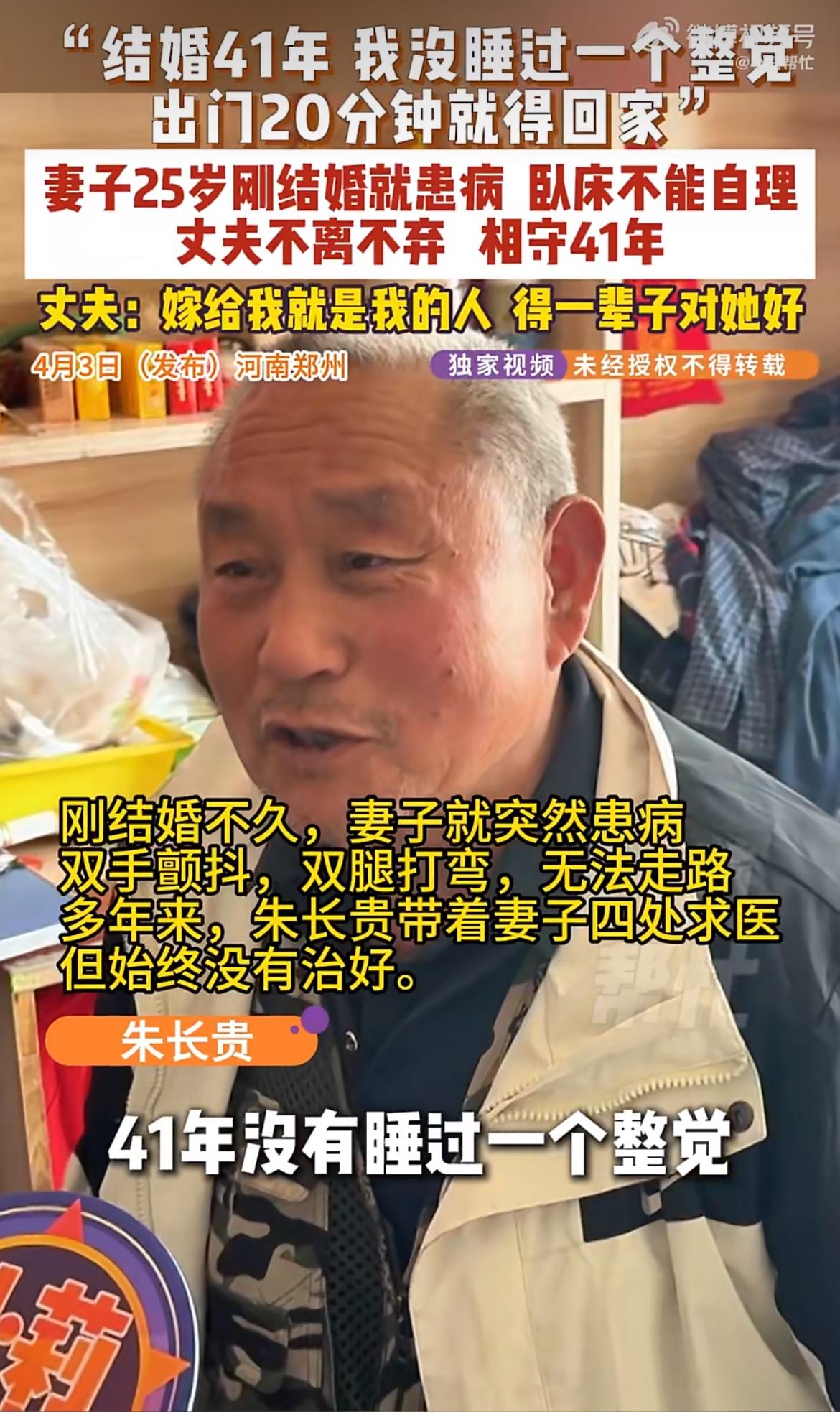 不离不弃!妻子25岁刚结婚就患怪病卧床,全身抖动没法自理,丈夫41年花百万求医,没睡过整觉,出门超20分钟就得往家赶!妻子多次提离婚不想拖累他,丈夫却死活不同意!这41年的坚守背后,究竟有什么不为人知的故事? 河南郑州一对夫妻,用41年的坚守诠释了什么叫“不离不弃”。丈夫朱长贵今年已经60多岁了,自从妻子25岁那年患病卧床,他就再没睡过一个整觉,出门超过20分钟就得赶紧往家赶,生怕妻子有什么需要。 41年前,朱长贵和妻子刚结婚不久,妻子突然患上了一种怪病,全身抖动无法自理,连吃饭、喝水、翻身这些最基本的生活需求都得靠别人帮忙。刚开始朱长贵带着妻子四处求医,跑了好多家医院,花了不少钱,但妻子的病情始终没有明显好转。 有人说夫妻本是同林鸟,大难临头各自飞。可朱长贵不这么想。他觉得妻子嫁给他就是他的人,得一辈子对她好。这话他说了41年,也做了41年。从妻子患病那天起,朱长贵就承担起了照顾她的全部责任。每天早上,早早起床给妻子喂水、按摩、擦身,然后准备早饭。吃饭的时候,他得一口一口地喂,有时候妻子吃不下去,他就耐心地哄着,像照顾孩子一样。 白天也不敢出门太久。怕妻子一个人在家害怕,也怕她有什么需要找不到人。就算出门买菜、办点事,也得赶紧回来,生怕耽误了照顾妻子。晚上更是睡不踏实。妻子稍微有点动静,他就得赶紧起来看看,是不是需要翻身,是不是哪里不舒服。41年来,他几乎没睡过一个安稳觉。 有人说朱长贵图什么?妻子患病这么多年,不仅不能帮他分担家务,还得花那么多钱治病。可朱长贵从来没想过这些。他说钱没了可以再赚,但妻子只有一个。为了给妻子治病,他花光了家里的积蓄,还借了不少外债,总共花了100多万。可他从来没抱怨过,也没想过放弃。 妻子看在眼里,疼在心里。她知道丈夫为她付出了太多太多。她觉得自己是个累赘,想和丈夫离婚,不想再拖累他。可朱长贵坚决不同意。他说嫁给他就是他的人,得一辈子对她好。这句话,让妻子感动得泪流满面。 朱长贵的事被媒体报道后,很多人被他的坚守和付出所感动,纷纷点赞转发。有人说这才是真正的爱情,不离不弃,白头到老。有人说朱长贵是男人的榜样,有担当、有责任。还有人说希望社会能多关注这样的家庭,给他们更多的帮助和支持。 其实像朱长贵这样的好男人还有很多。他们或许没有惊天动地的壮举,但他们的坚守和付出同样让人感动。他们用自己的行动诠释了什么叫“爱是不离不弃”,什么叫“责任和担当”。 如果你也被朱长贵的故事所感动,点赞转发,让更多的人看到这份坚守和付出。关注我,为你带来更多温暖人心的故事。大众9X预售发布 可爱多一点,干爽多一点 来源:小莉帮忙