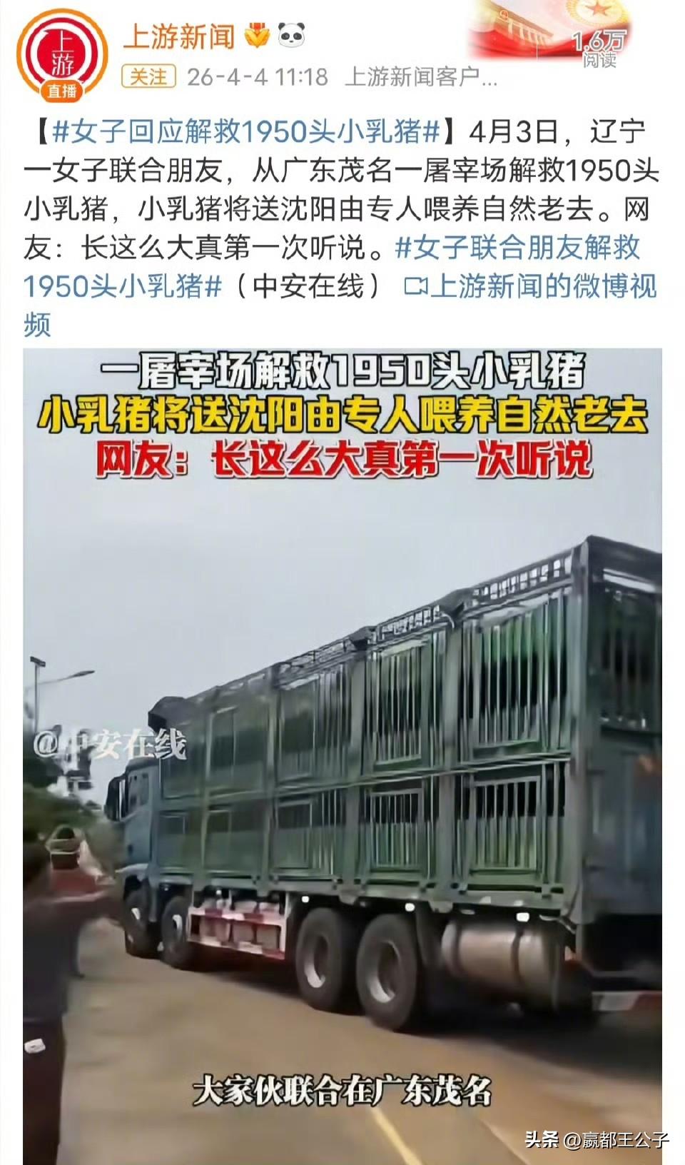 额,为什么要从广东运到沈阳给猪养老,是觉得北方不吃烤乳猪吗? 1950头烤小乳猪,每天的饲料可不是一个小数目,如果这些小乳猪能保持健康,活15年不成问题,光饲料费用都要超过5000万。 请问这位辽宁的女性,准备拿出多少钱和多少精力来喂养这些小乳猪? 可以很确定的说,这些小乳猪要不就是被饿死,要不就是被这位女性卖给屠宰场。 当然还有一种更“圣母”的方式,就是直接非法“放生”,让这些小乳猪死在野外。