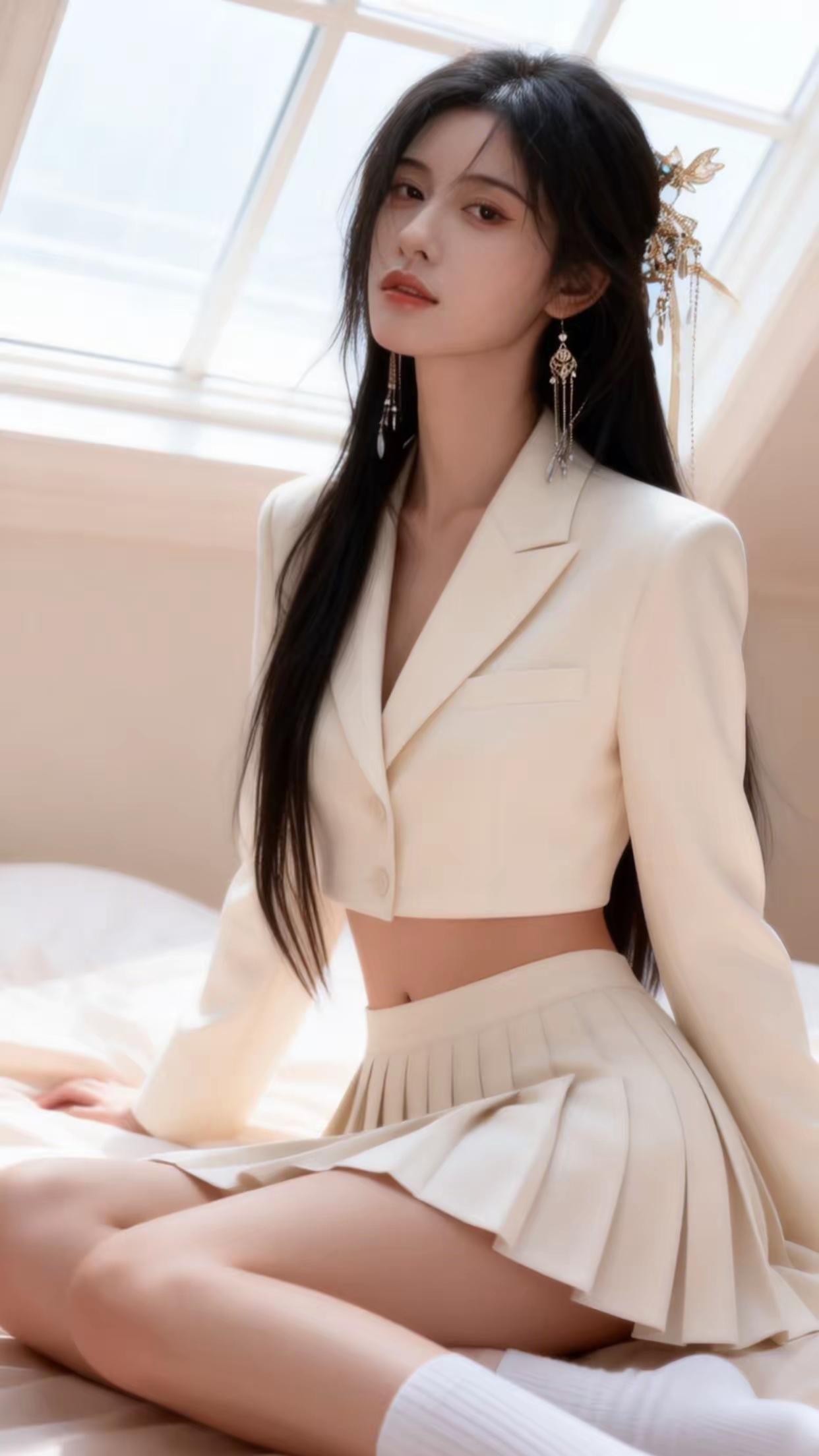 优雅少女风,米色西装搭配百褶裙,精致耳饰点缀,自然光下更显温柔。