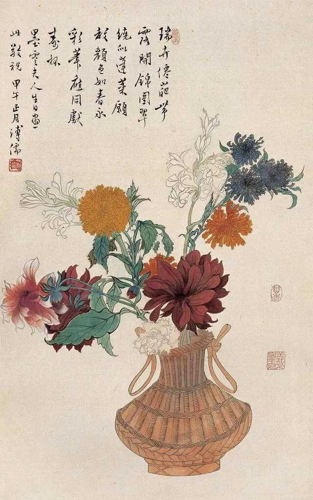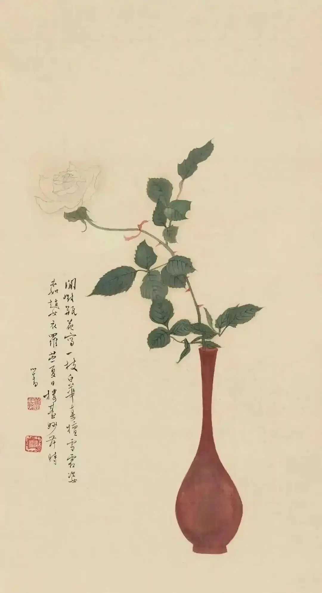 溥心畬绘瓶花,清雅绝俗。溥心畬得传统正脉,受马远、夏圭的影响较深。他在传统山水画法度严谨的基础上灵活变通,创造出新,开创自家风范。溥心畲的清朝皇室后裔的特殊身份使他悟到荣华富贵之后的平淡才是人生至境,因而他在画中营造的空灵超逸的境界令人叹服。遇见艺术这就是中国风