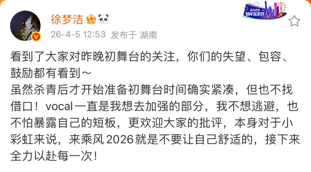 徐梦洁发文回应初舞台徐梦洁vocal一直是我想去加强的部分徐梦洁发文回应初舞台