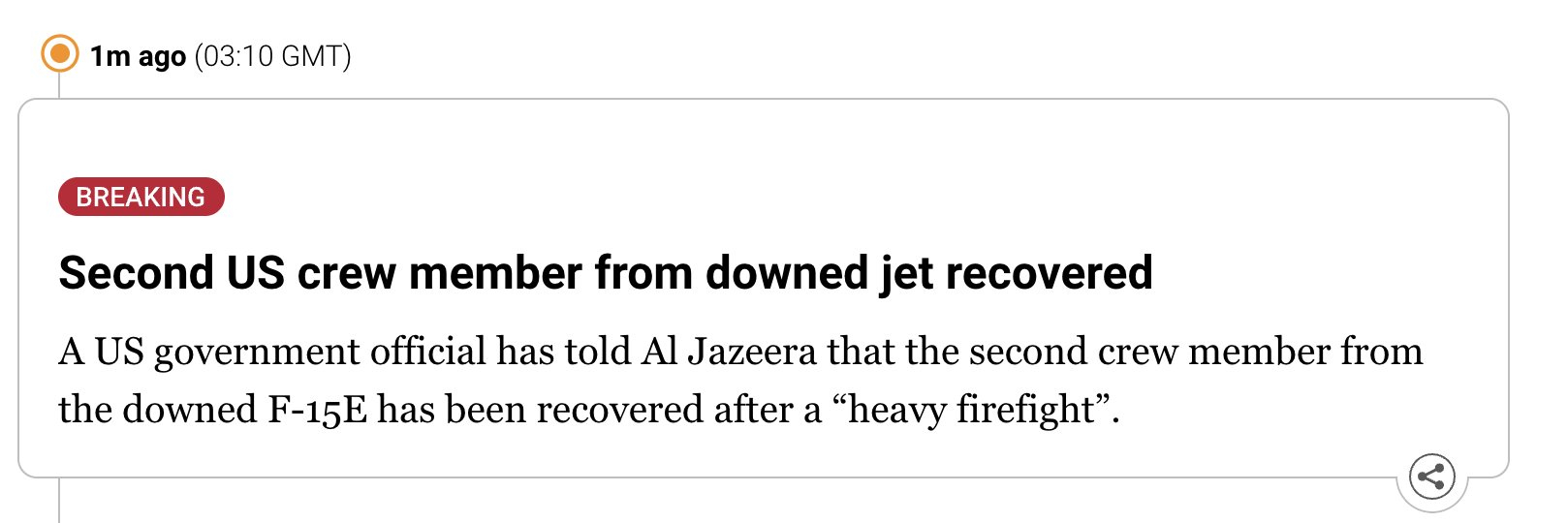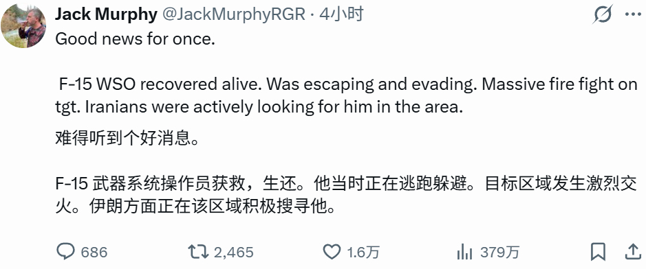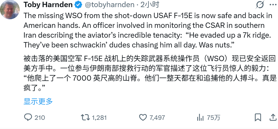 🔻半岛电视台10分钟前称,根据美国官员透露,美军特种搜救部队“守护天使”已经将第二名飞行员从伊朗山区救出。🔻根据一些内部人士消息数小时前称,该名美军飞行员在伊朗山区中东躲西藏,不断转移位置攀爬山顶,躲避伊朗搜索追兵,甚至爬上了7000英尺的山顶,接近48个小时没休息。